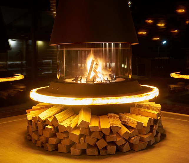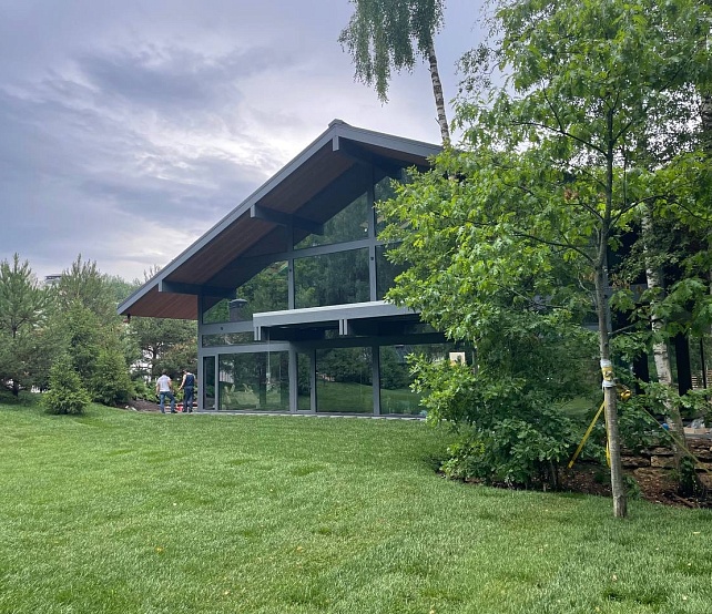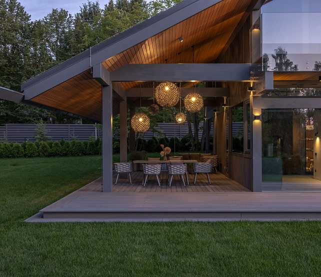 Особого внимания заслуживает конструкция здания. Благодаря радиусной кровле и навесам по периметру дома создается уютное пространство для созерцательных минут на природе.