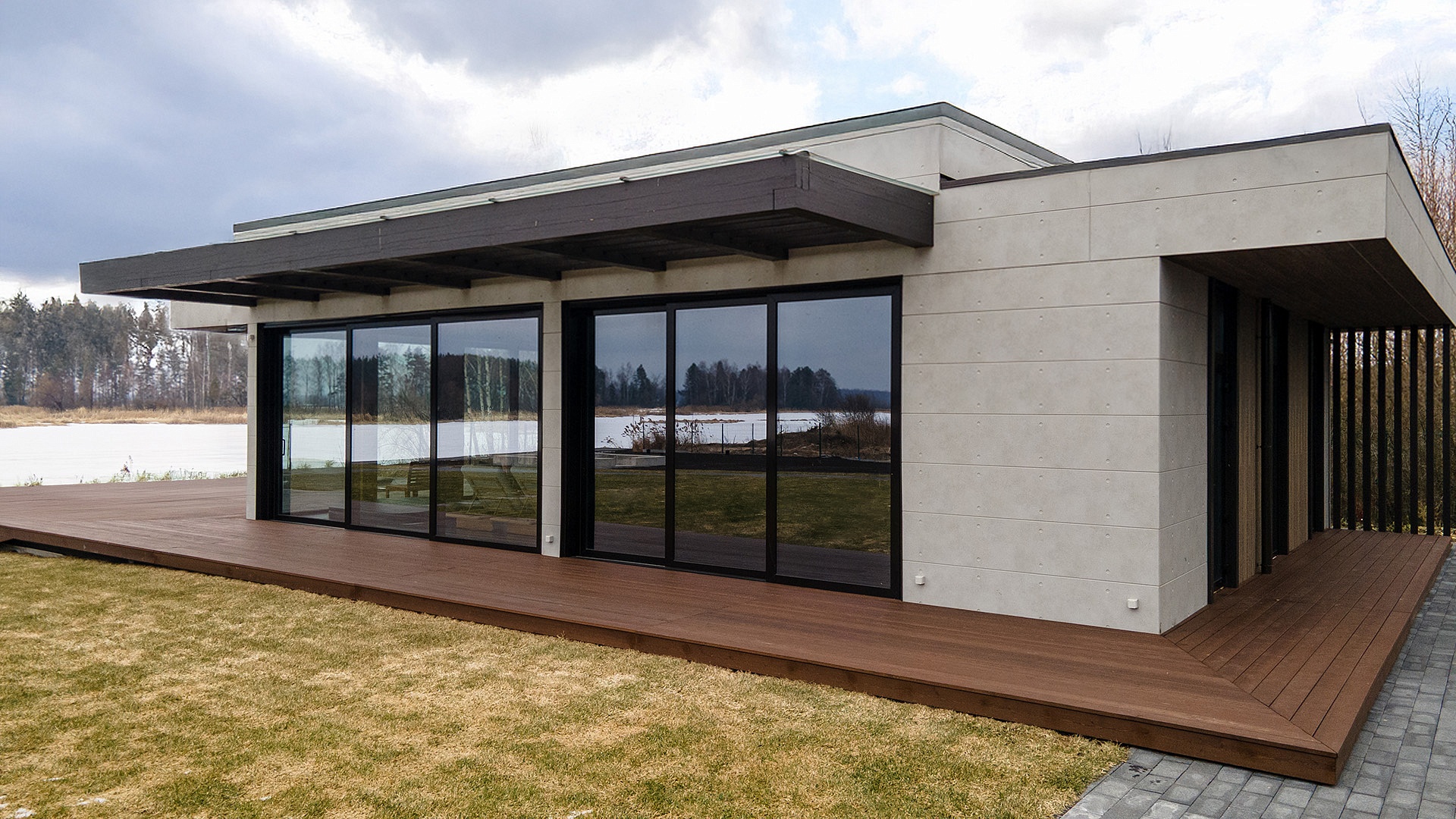 Проект "Биарриц", построенный по технологии фахверк - это комплекс зданий, объединенный многоуровневыми террасами плоской кровли.