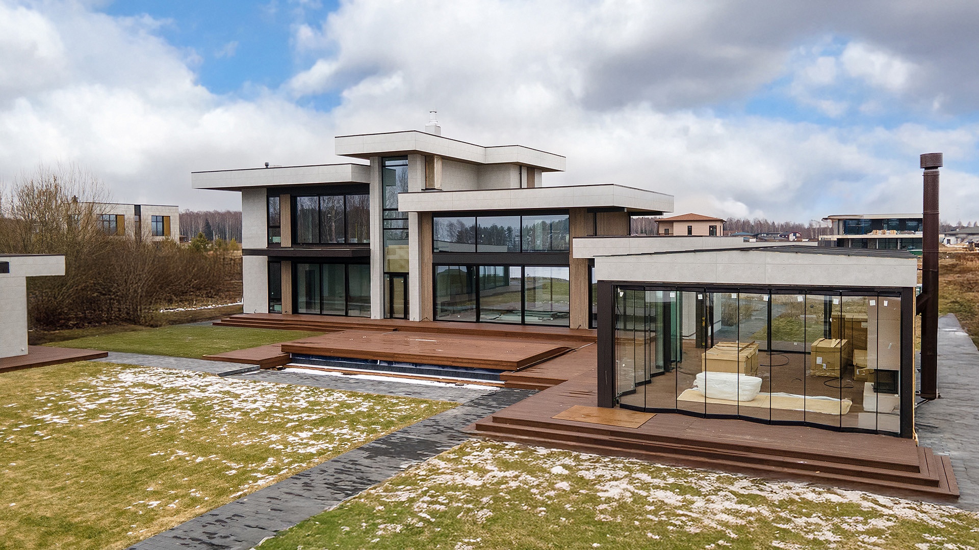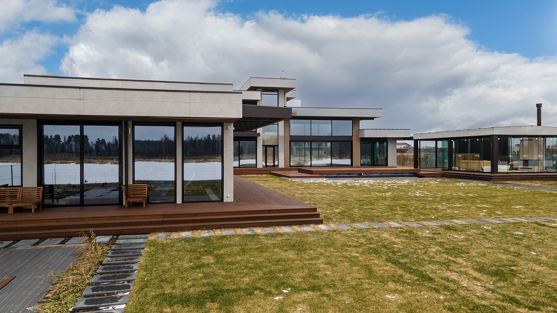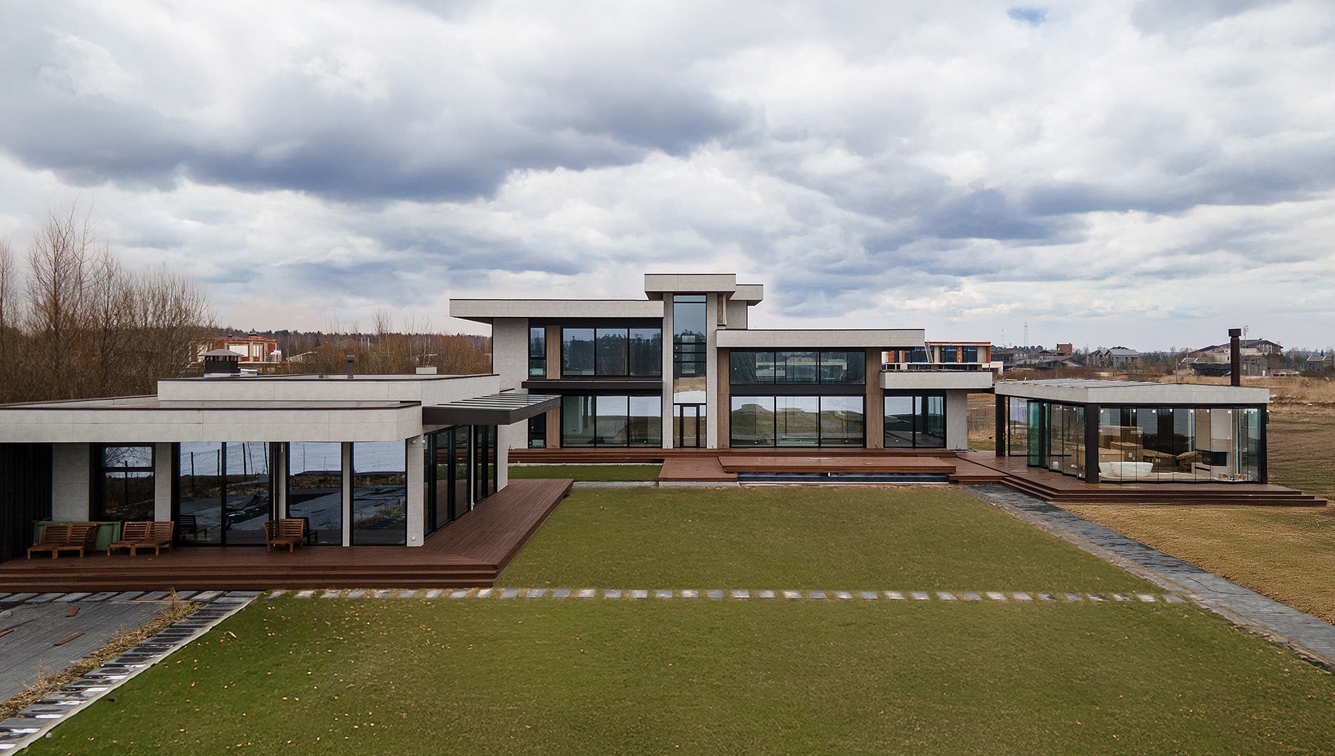 На территории расположен двухэтажный жилой дом с выходом на террасу с бассейном, большой павильон со стеклянными раздвижными ограждениями и SPA-комплекс с хаммамом, видовой парной, джакузи и тренажерным залом.