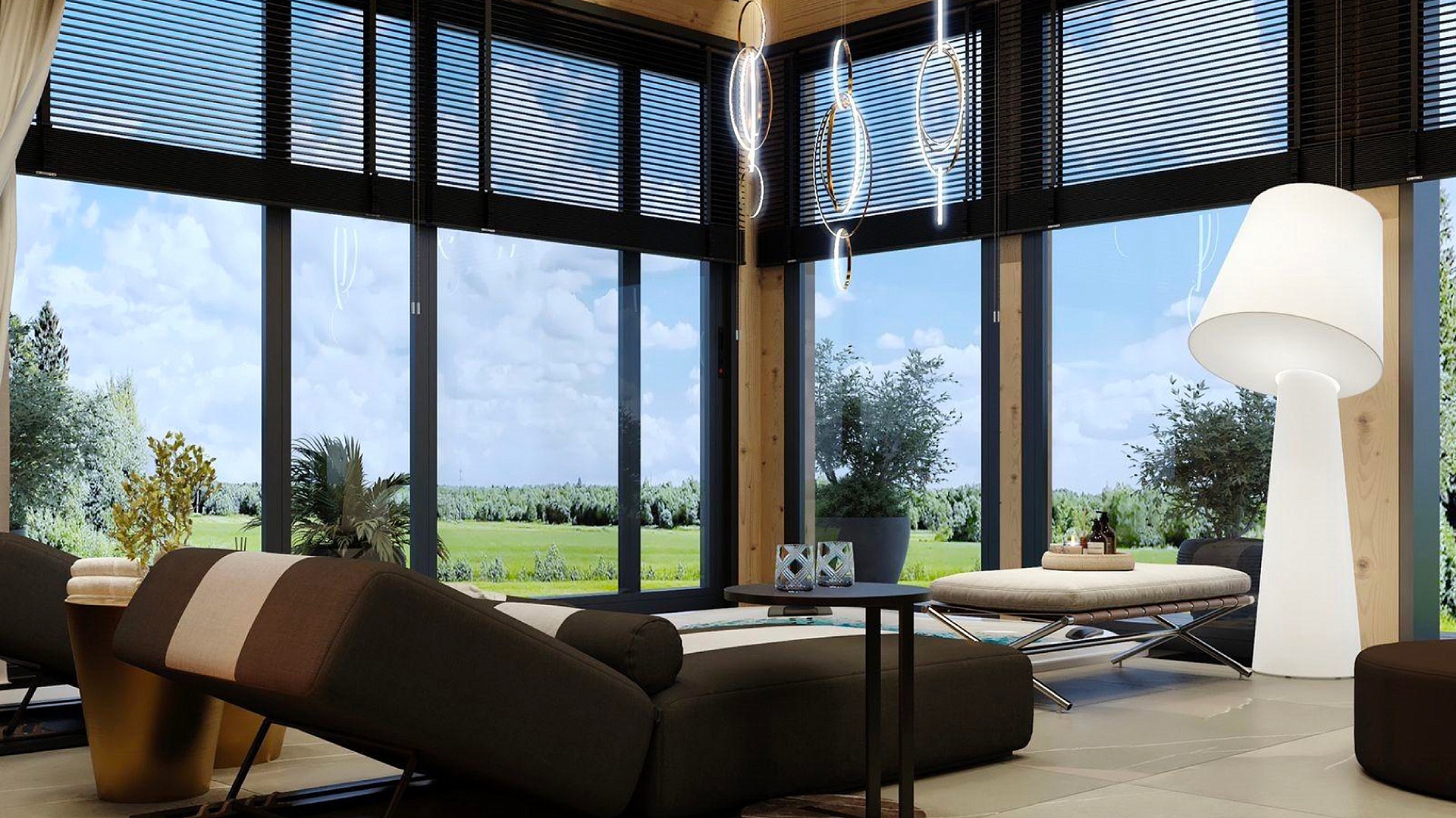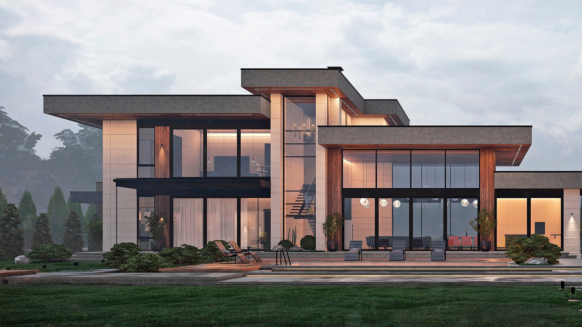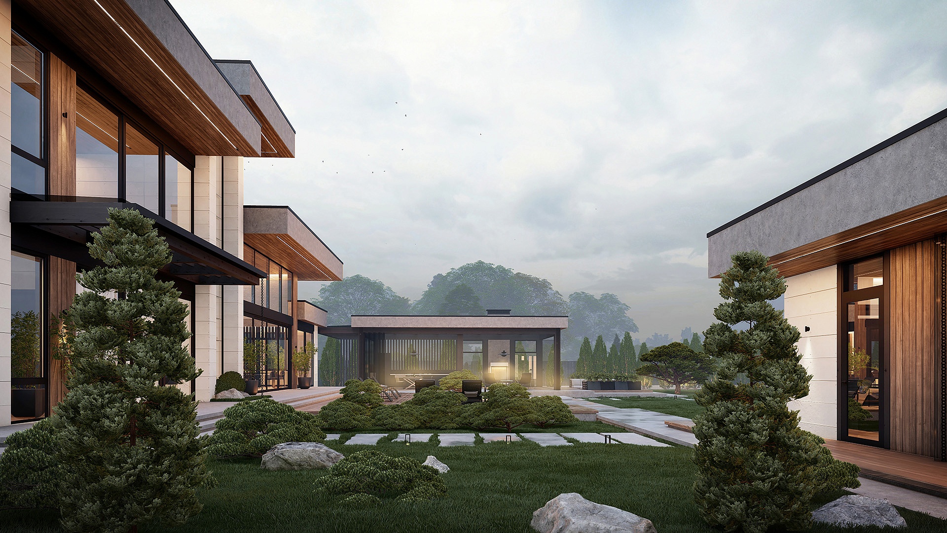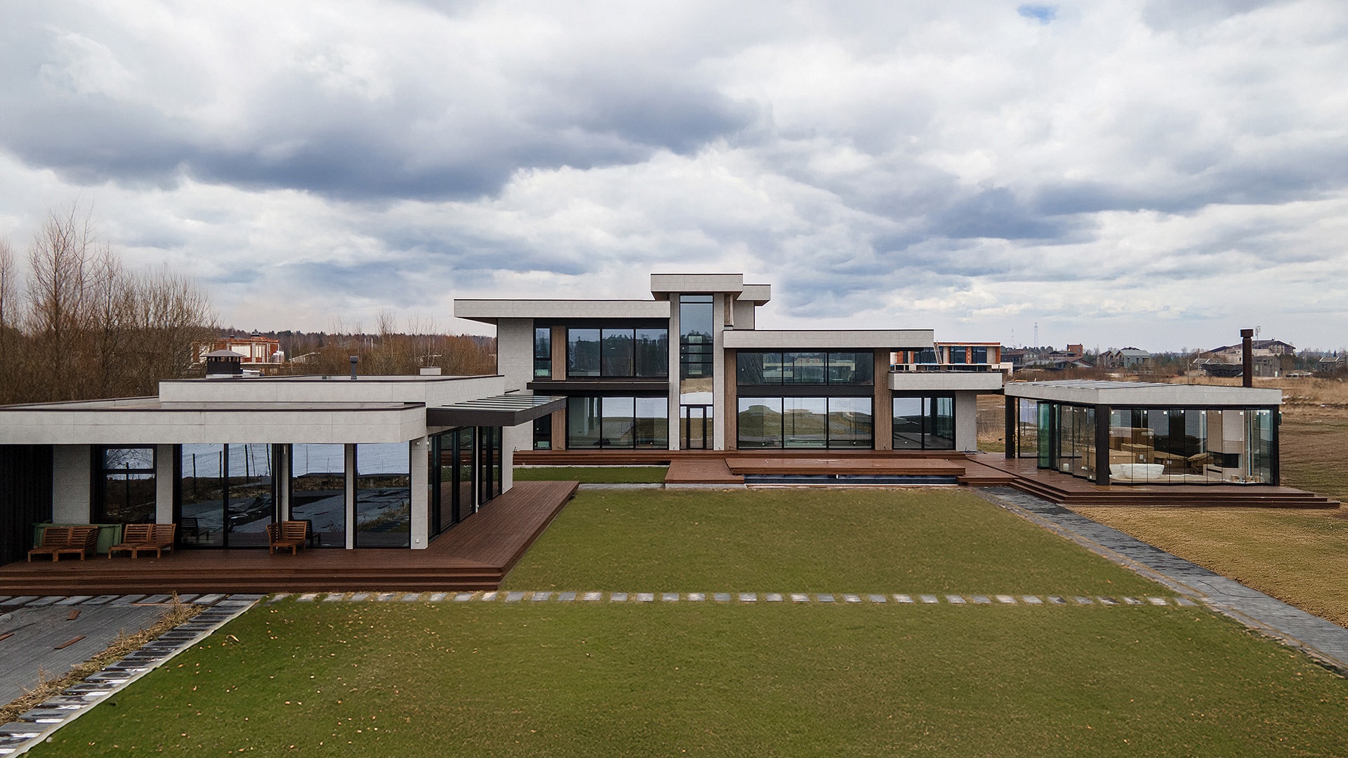 На территории расположен двухэтажный жилой дом с выходом на террасу с бассейном, большой павильон со стеклянными раздвижными ограждениями и SPA-комплекс с хаммамом, видовой парной, джакузи и тренажерным залом.