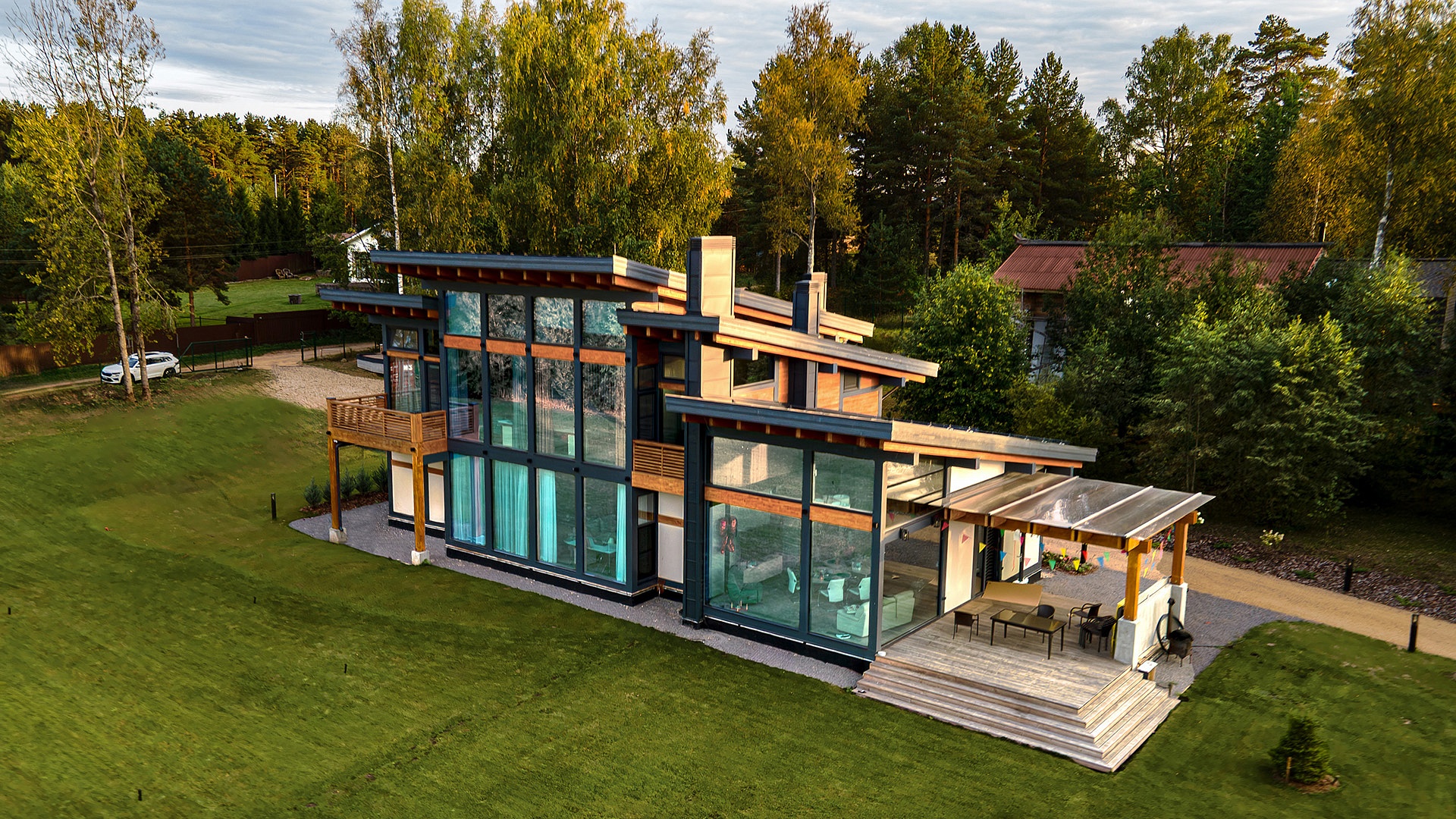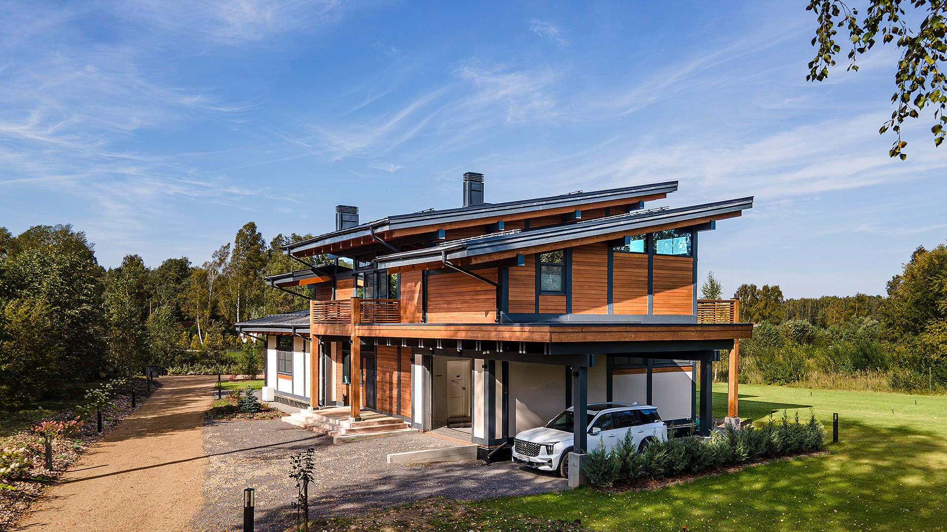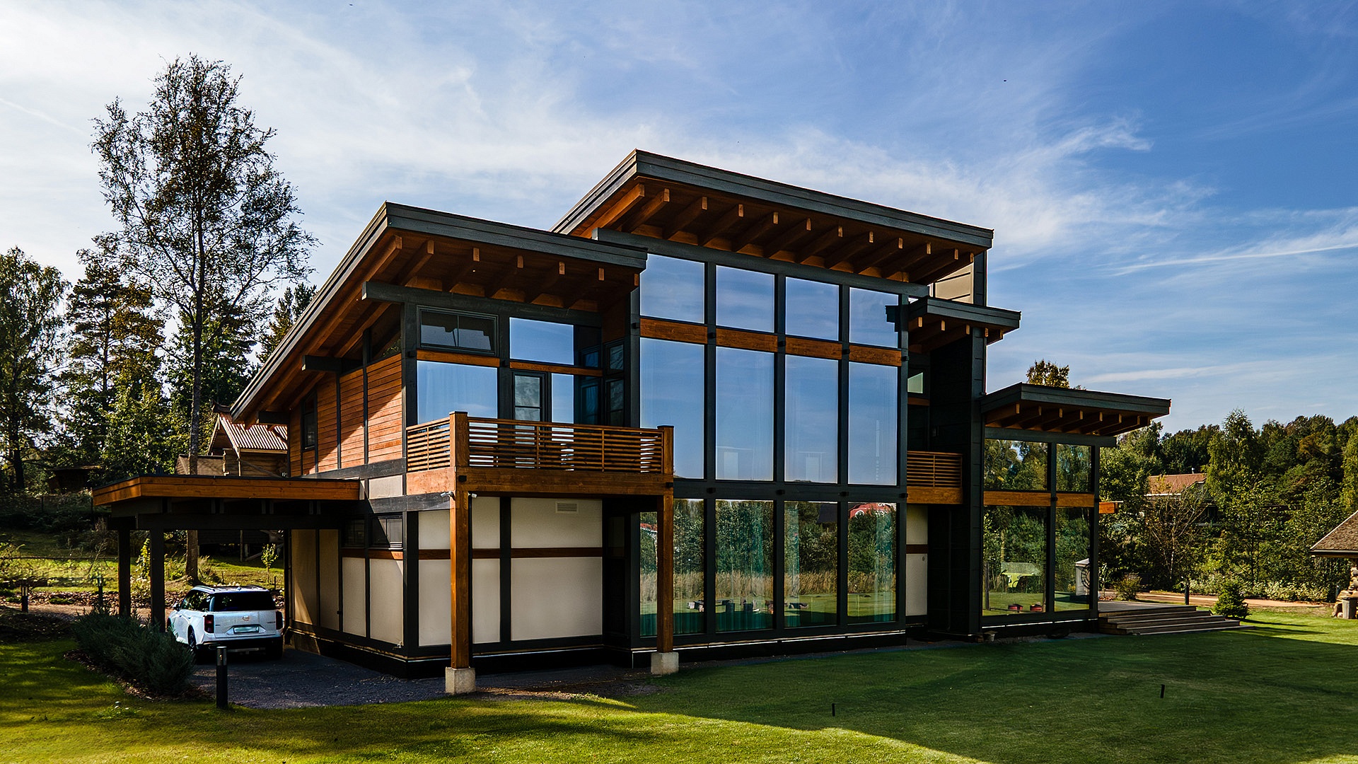Фахверковый дом «Купертино» площадью 396 м² (жилая 288 м²) расположен у Волги. Архитектура с панорамным остеклением и разноуровневой кровлей создаёт динамичный, лёгкий силуэт, отражающий в стекле воду и небо.