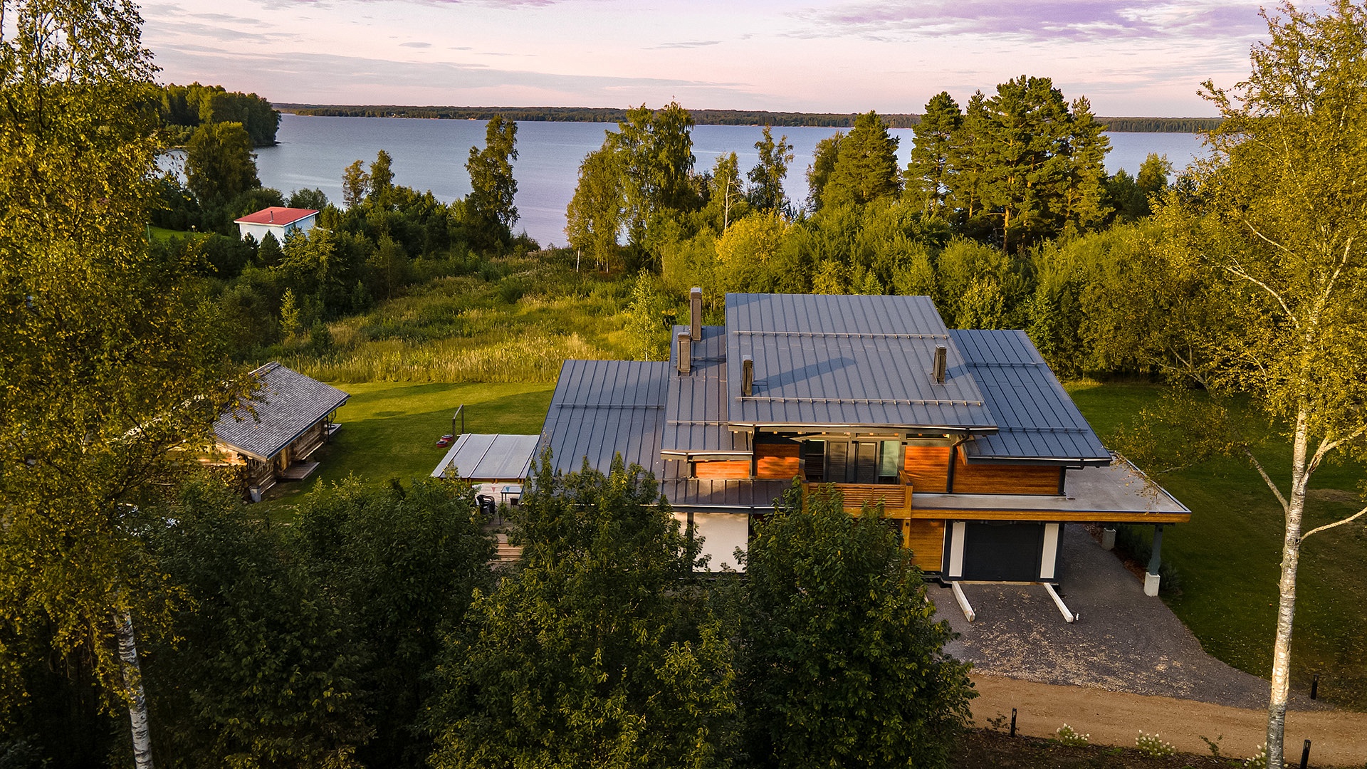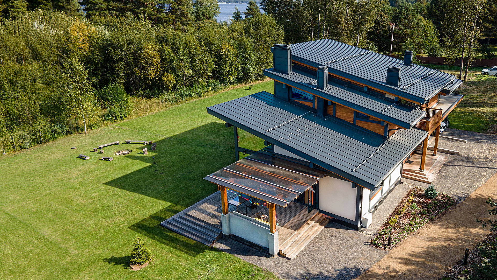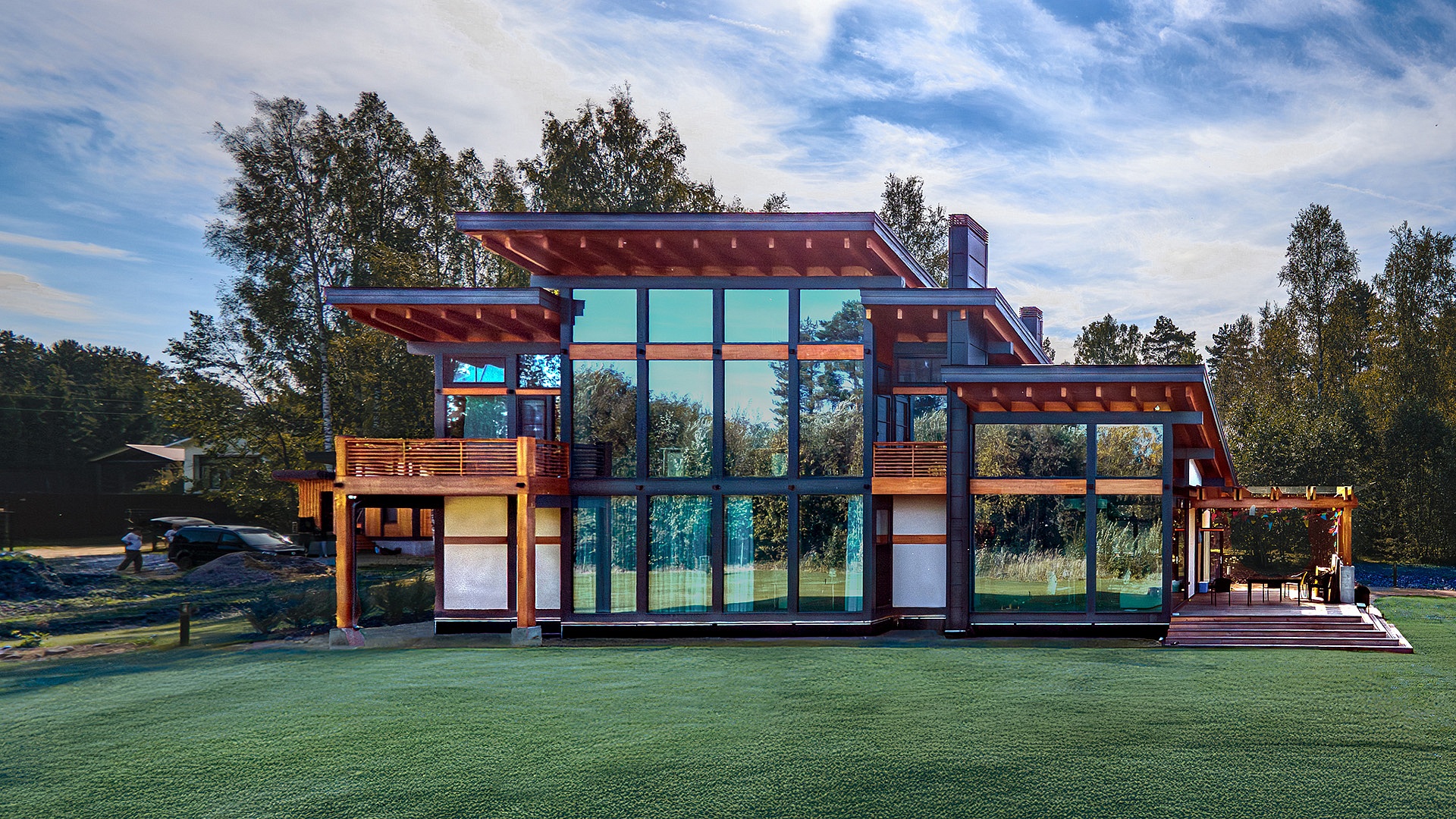Фахверковый дом «Купертино» площадью 396 м² (жилая 288 м²) расположен у Волги. Архитектура с панорамным остеклением и разноуровневой кровлей создаёт динамичный, лёгкий силуэт, отражающий в стекле воду и небо.