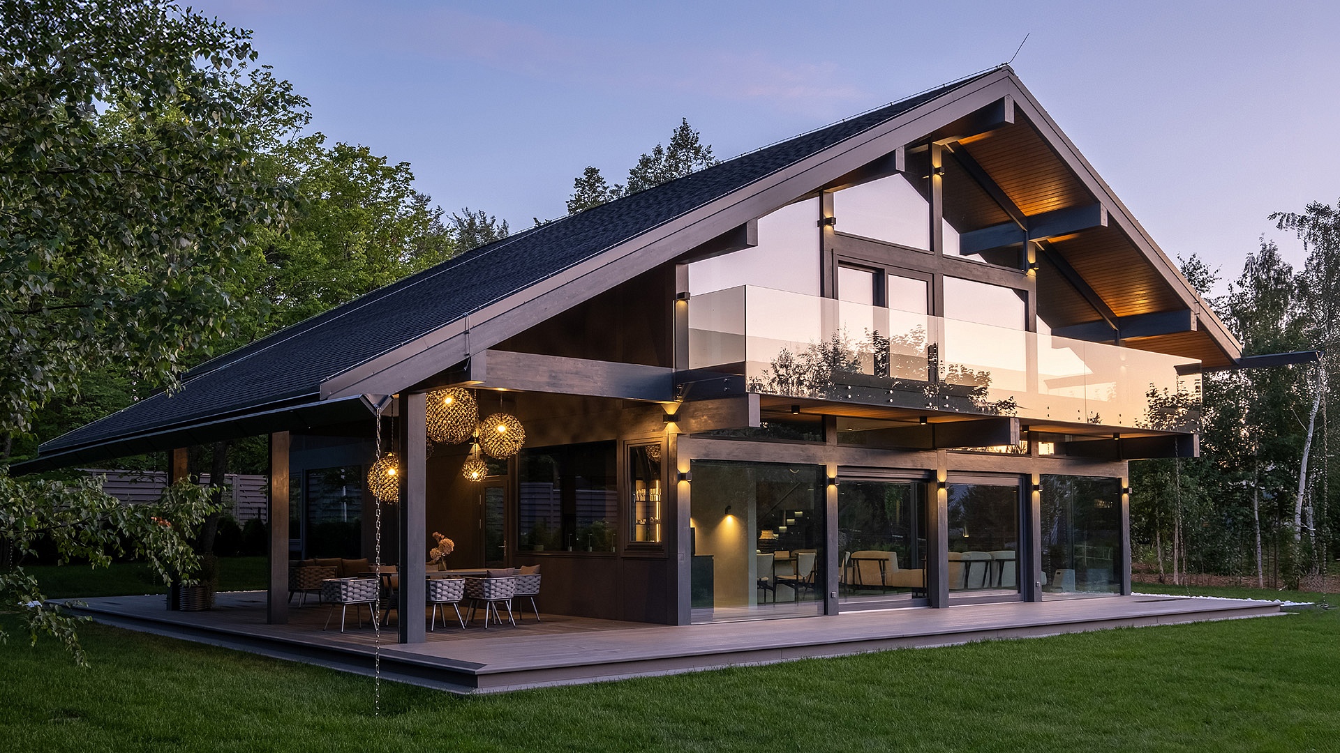 Масштабное панорамное остекление фахверкового дома, расположенного на берегу Истринского водохранилища, растворяет внешние границы между жилым пространством и природой.