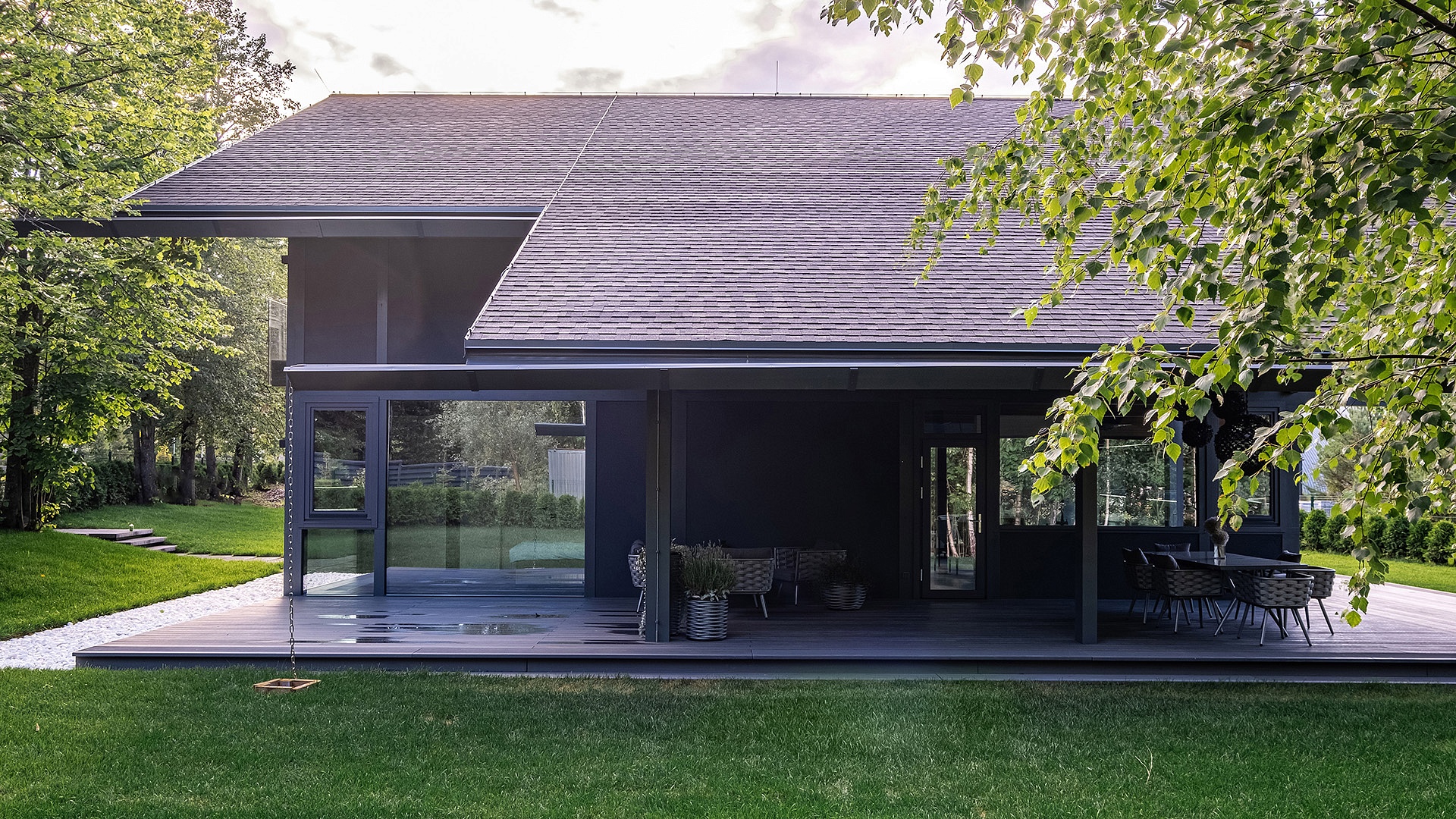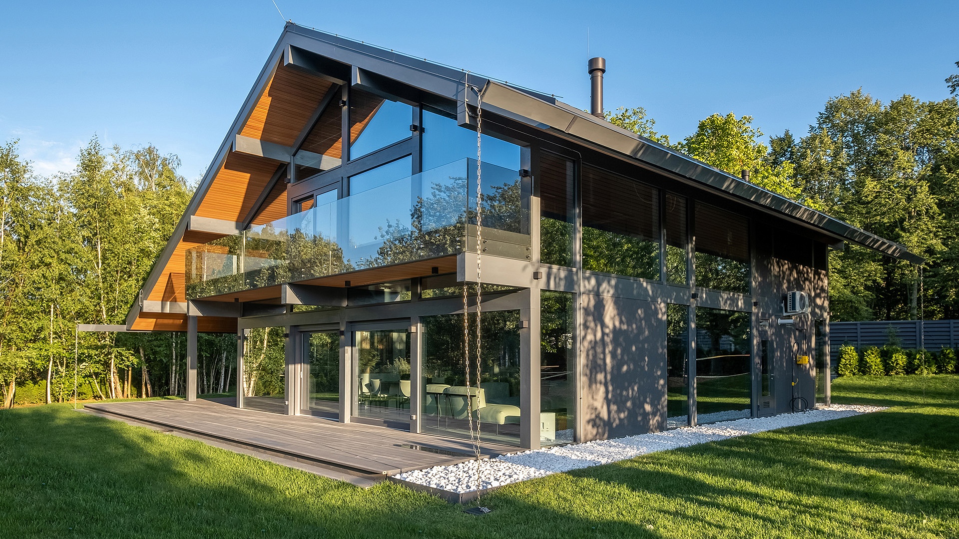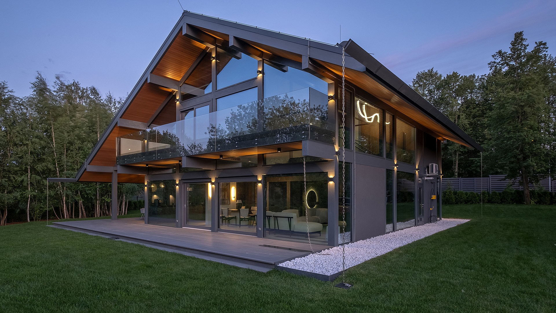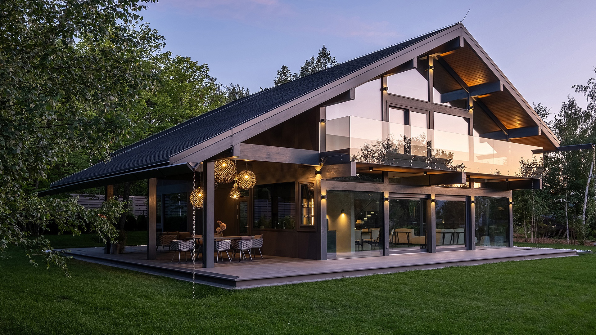 Фахверковый дом по проекту "Дольф" - это идеальное сочетание натуральных строительных материалов, архитектурной уникальности и стильного современного дизайна. С помощью сдвижного HS-портала и панорамного остекления мы добились полного единения с окружающей природой и ландшафтом.