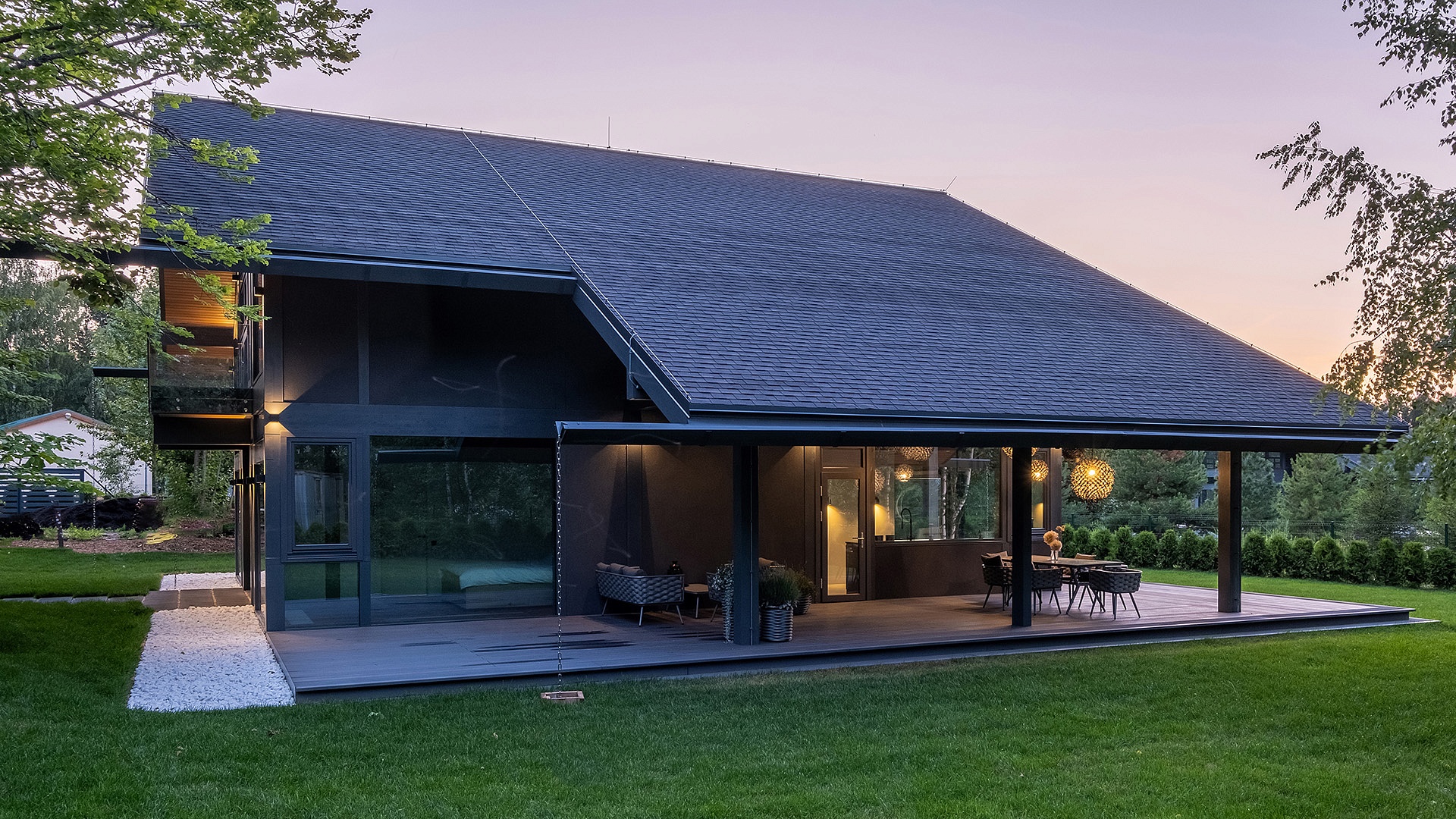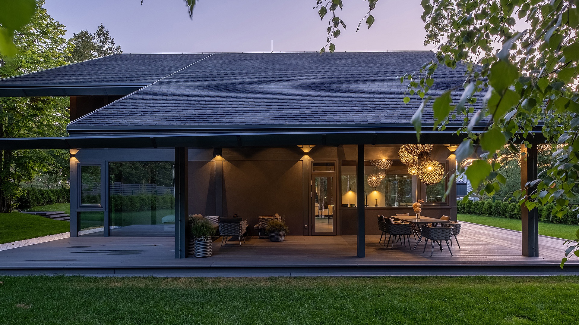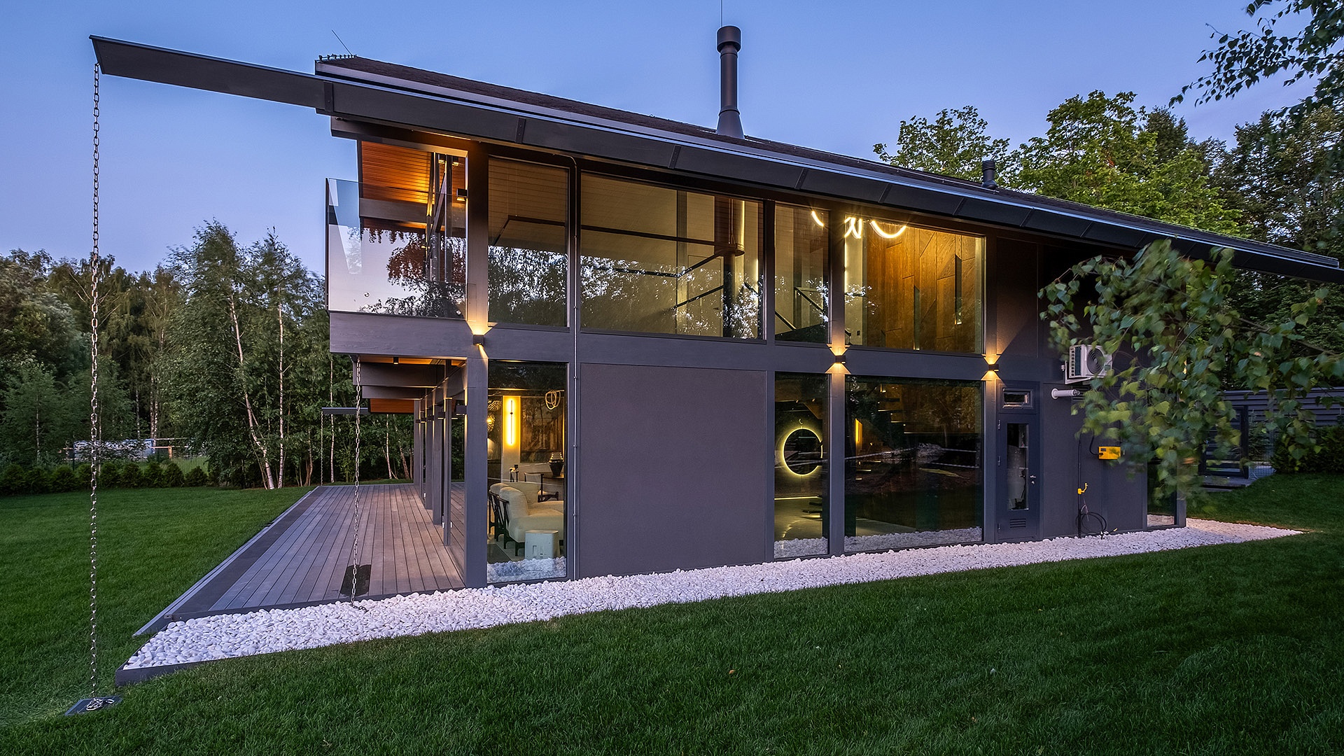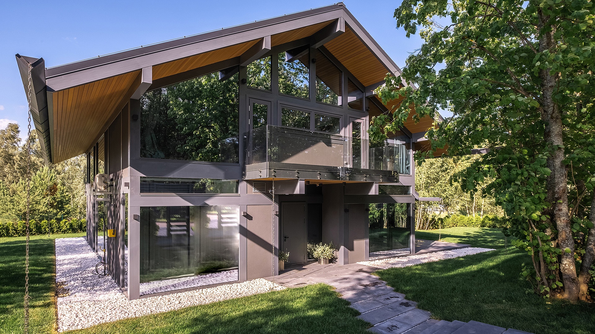 Фахверковый дом по проекту "Дольф" - это идеальное сочетание натуральных строительных материалов, архитектурной уникальности и стильного современного дизайна. С помощью сдвижного HS-портала и панорамного остекления мы добились полного единения с окружающей природой и ландшафтом.