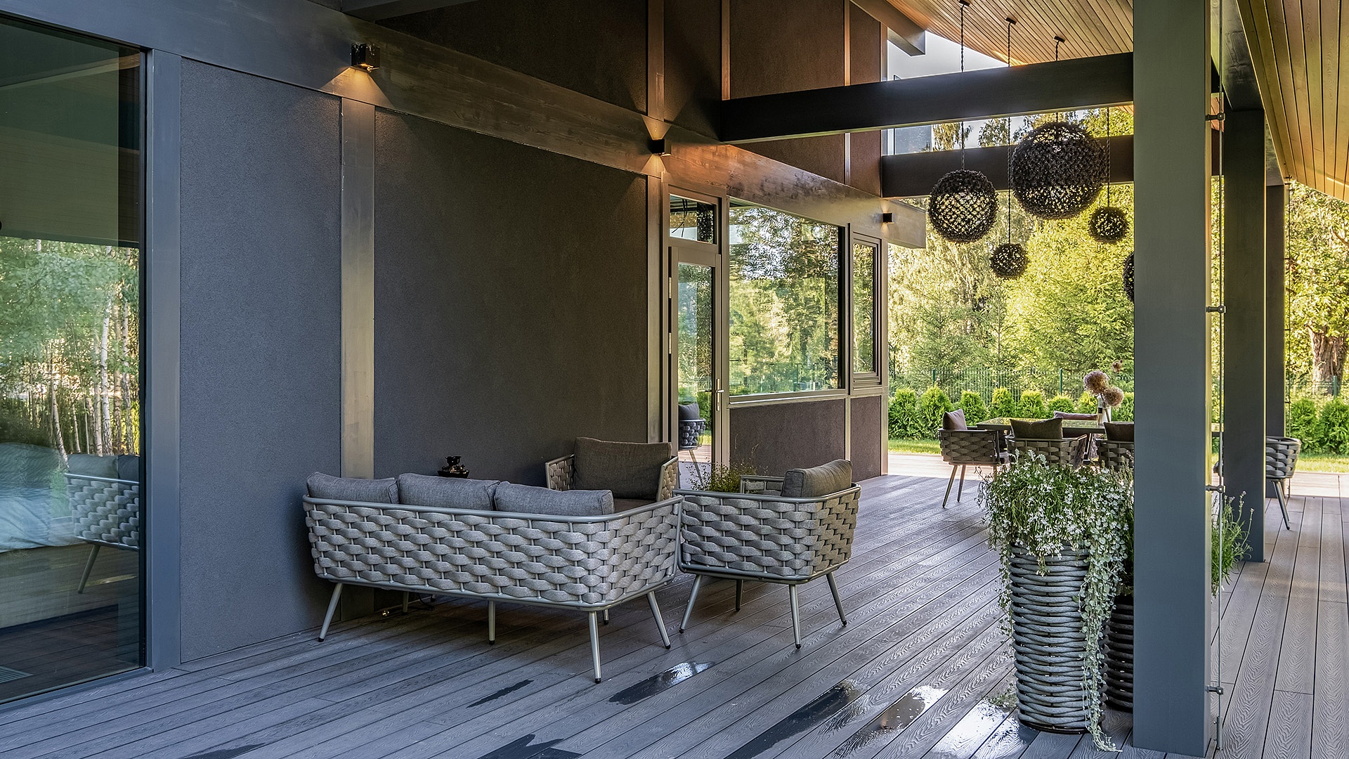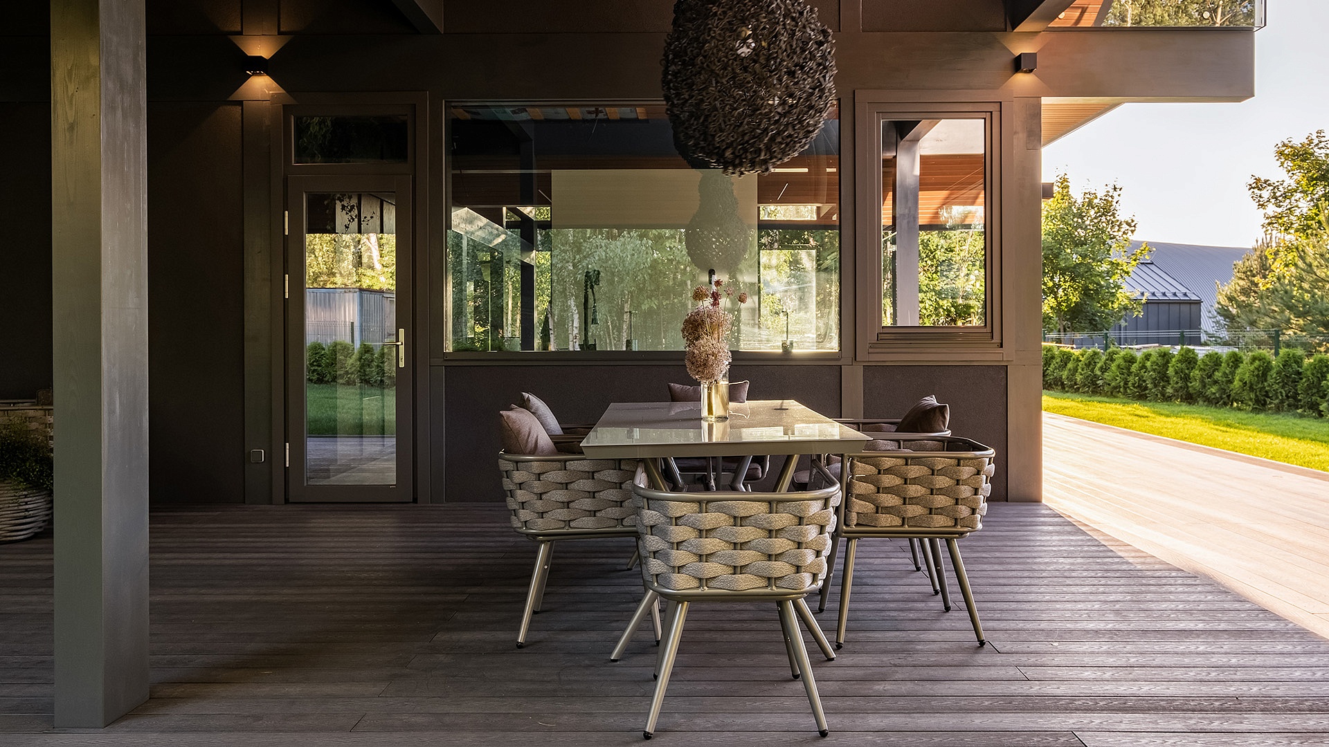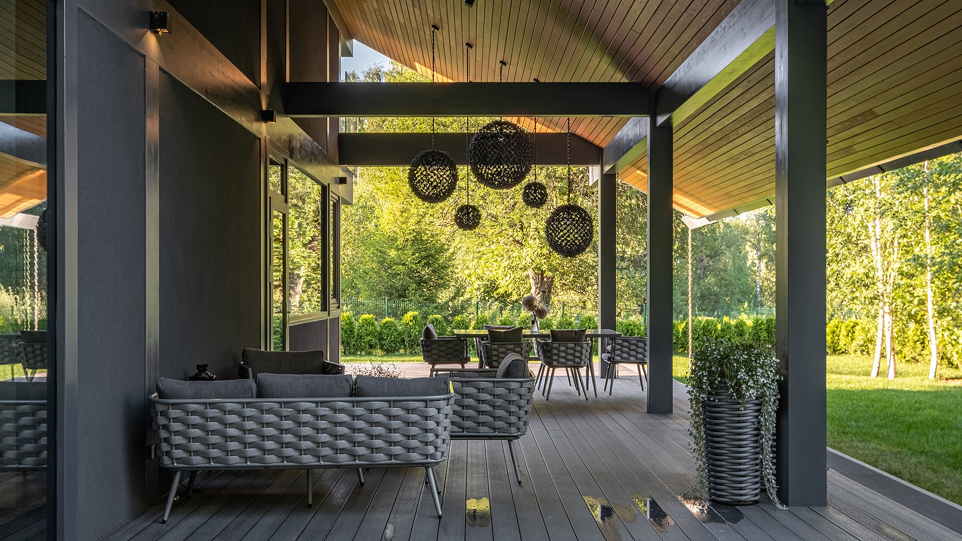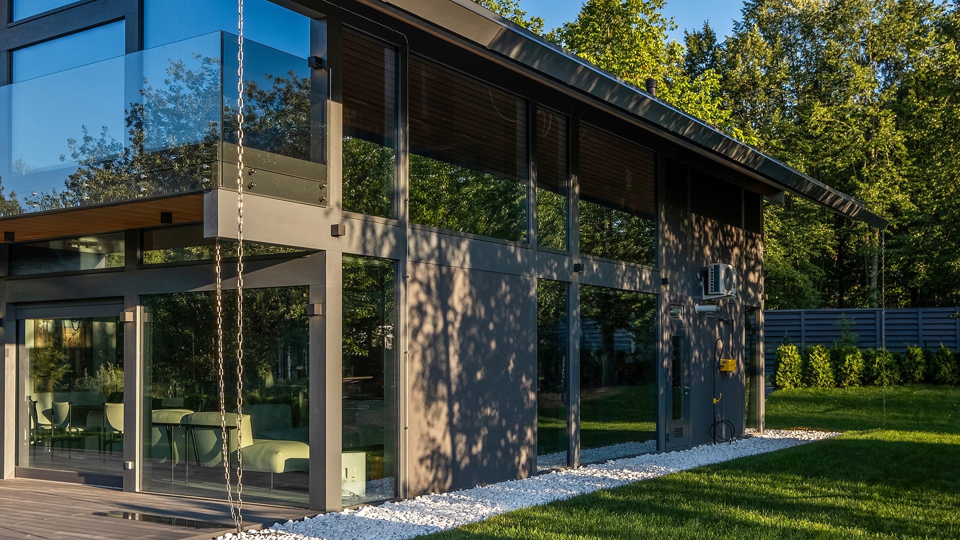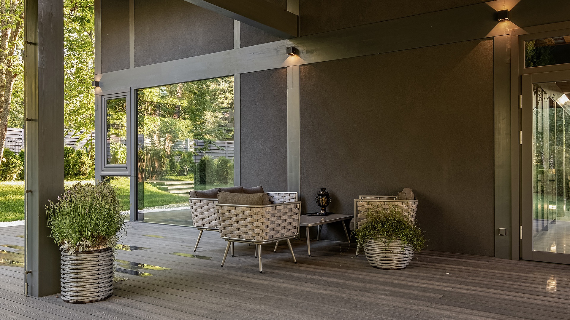 Фахверковый дом по проекту "Дольф" - это идеальное сочетание натуральных строительных материалов, архитектурной уникальности и стильного современного дизайна. С помощью сдвижного HS-портала и панорамного остекления мы добились полного единения с окружающей природой и ландшафтом.