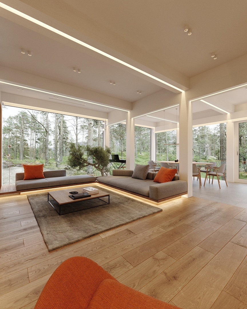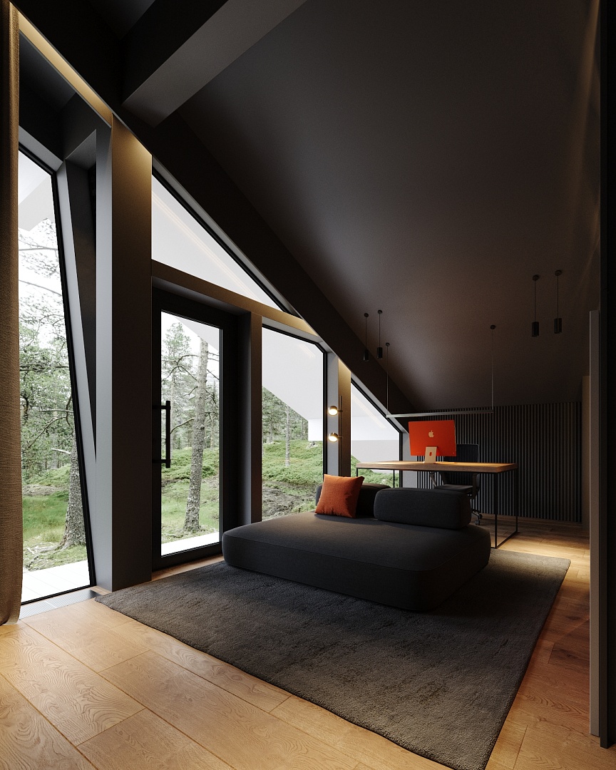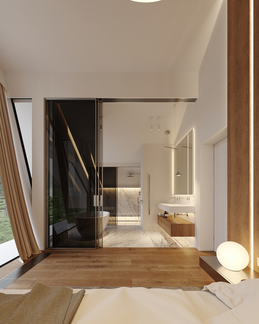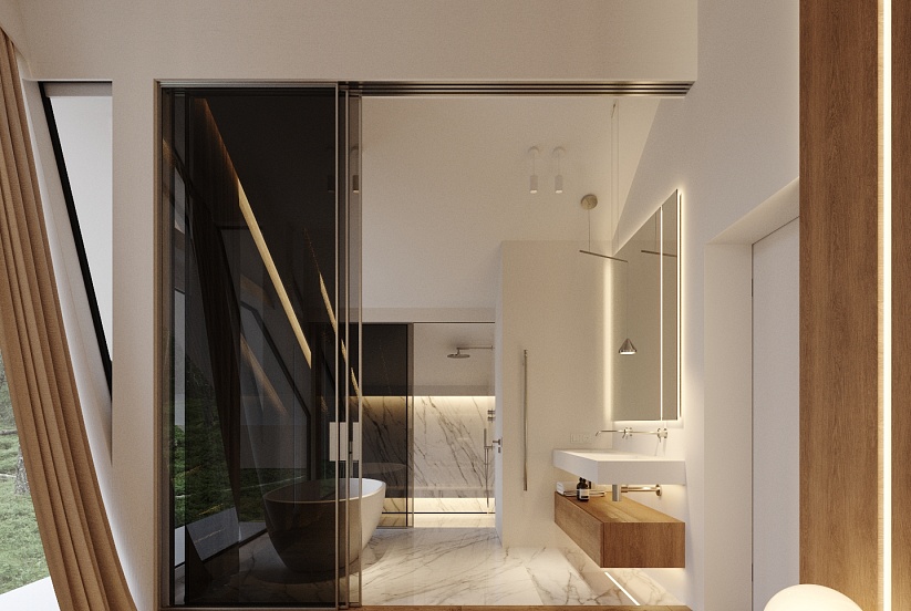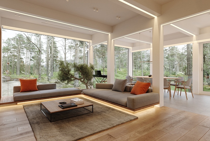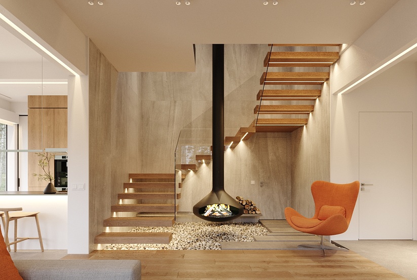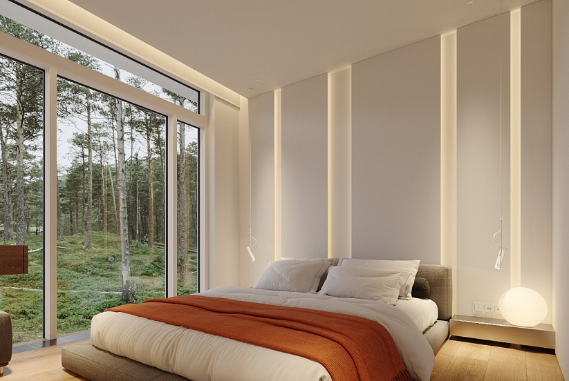 Фахверковый дом по проекту "Дольф" - это идеальное сочетание натуральных строительных материалов, архитектурной уникальности и стильного современного дизайна. С помощью сдвижного HS-портала и панорамного остекления мы добились полного единения с окружающей природой и ландшафтом.