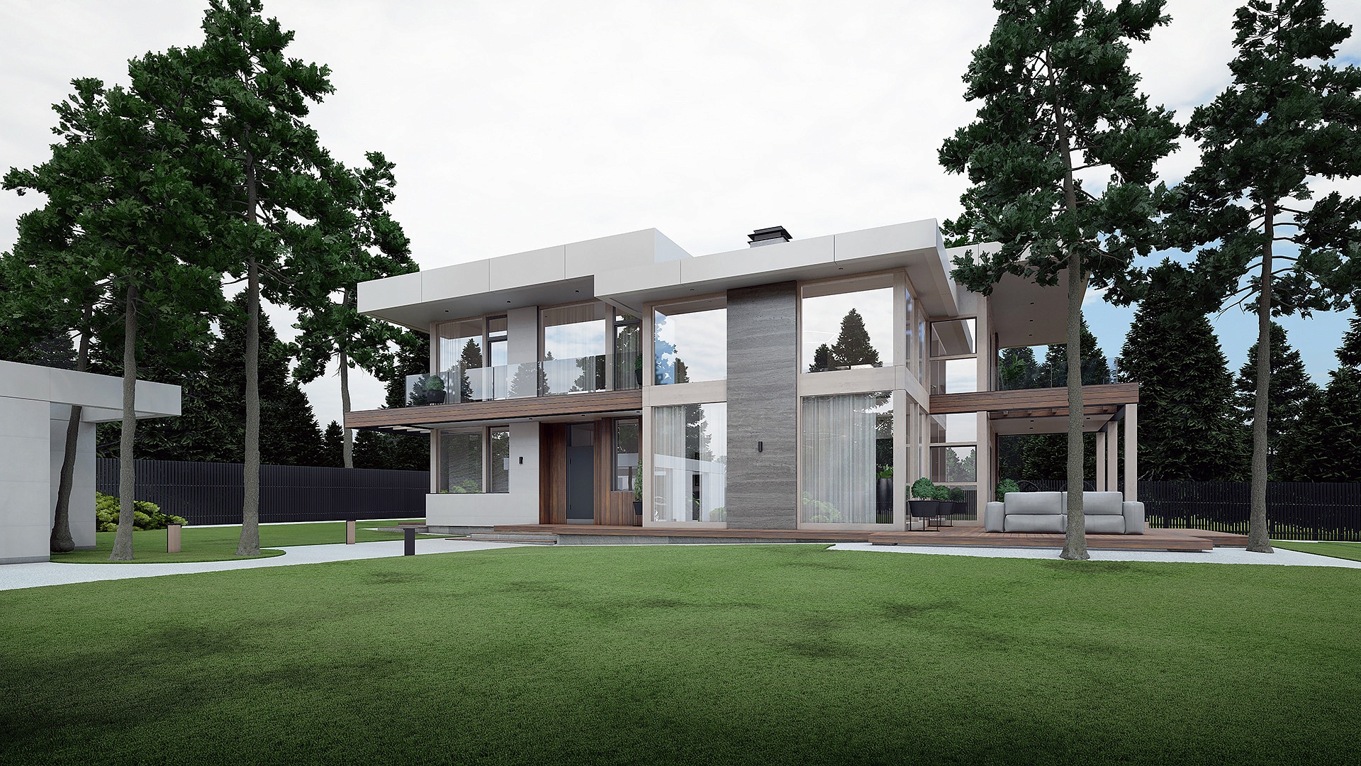 Панорамное остекление и раздвижной портал наполняют дом светом и связывают внутреннее пространство с просторной террасой.