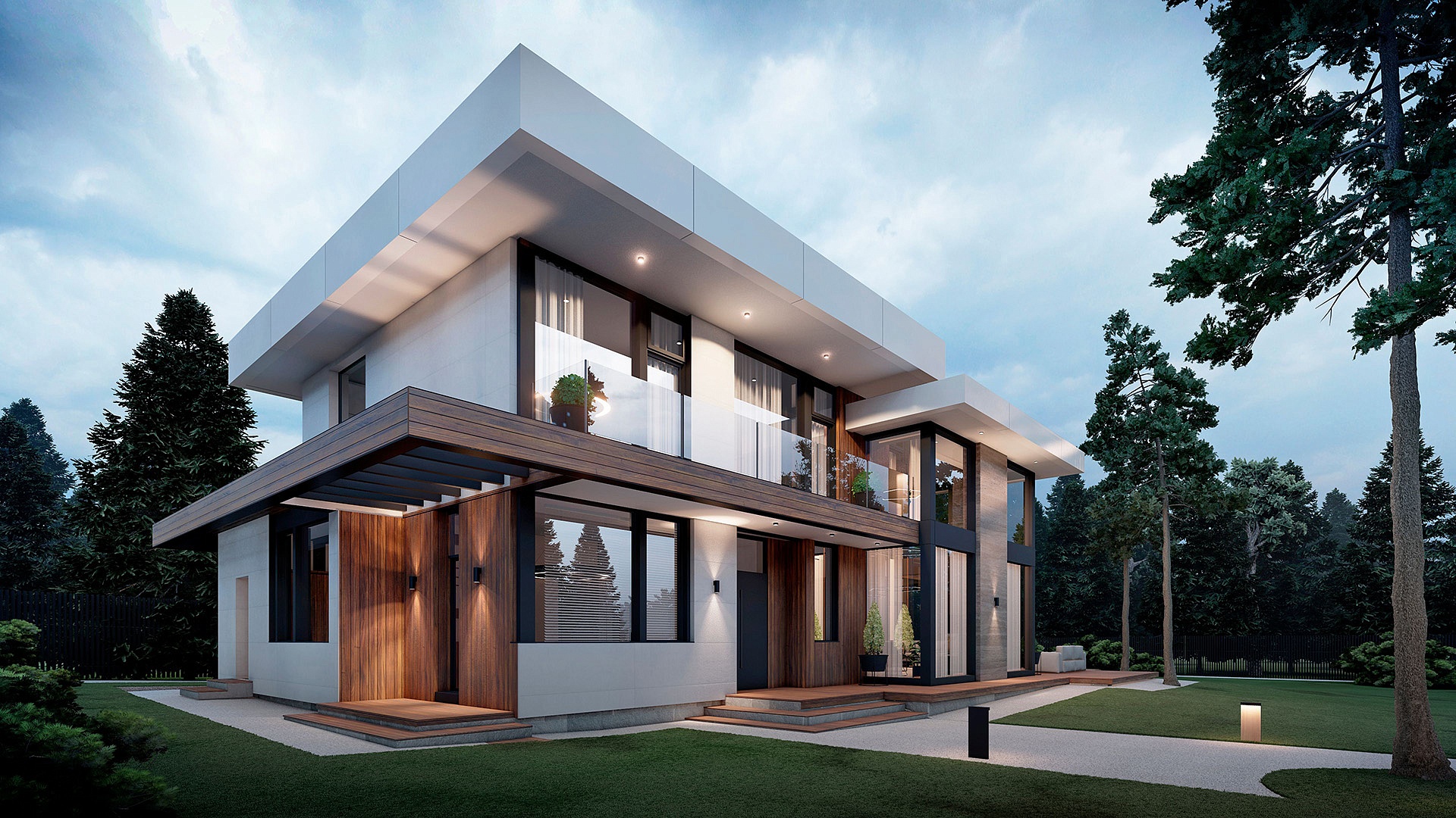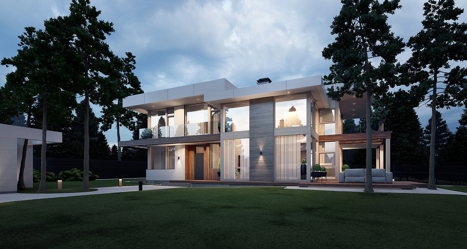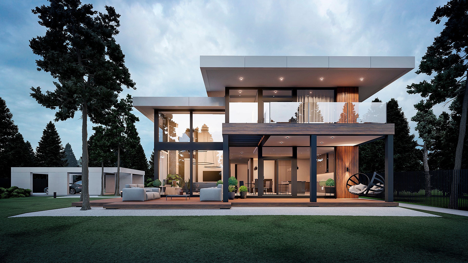 Архитектурная подсветка преображает внешние объемы дома в темное время суток: здание выглядит фактурнее, интереснее и объемнее.