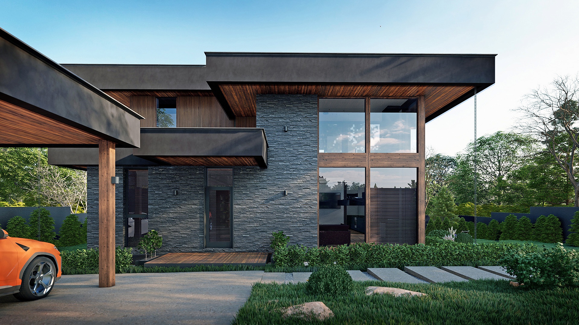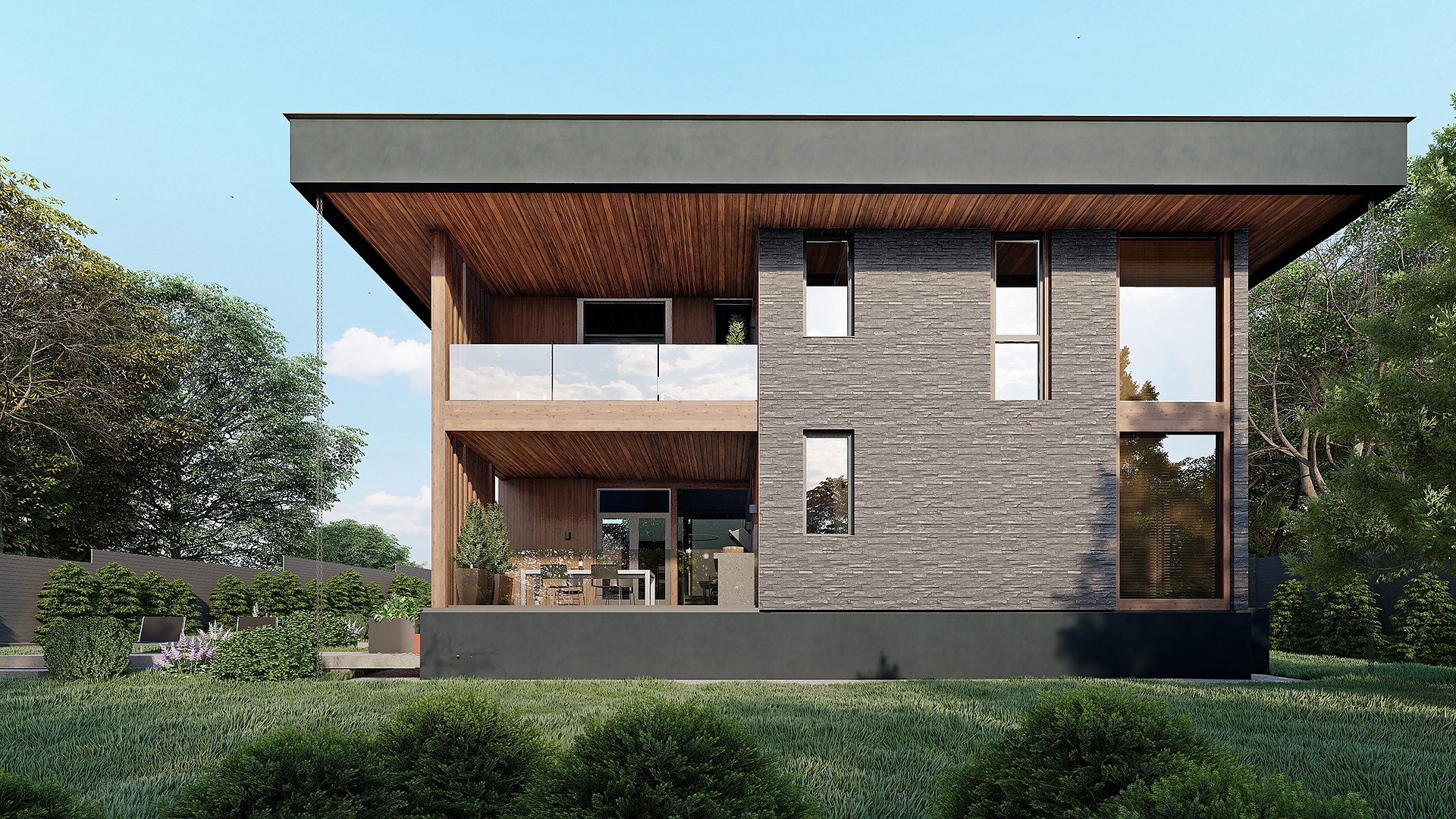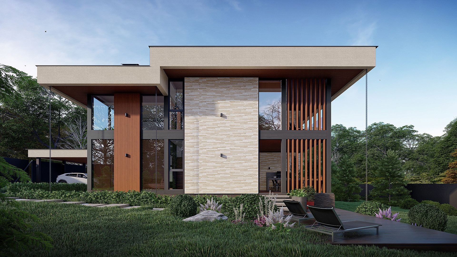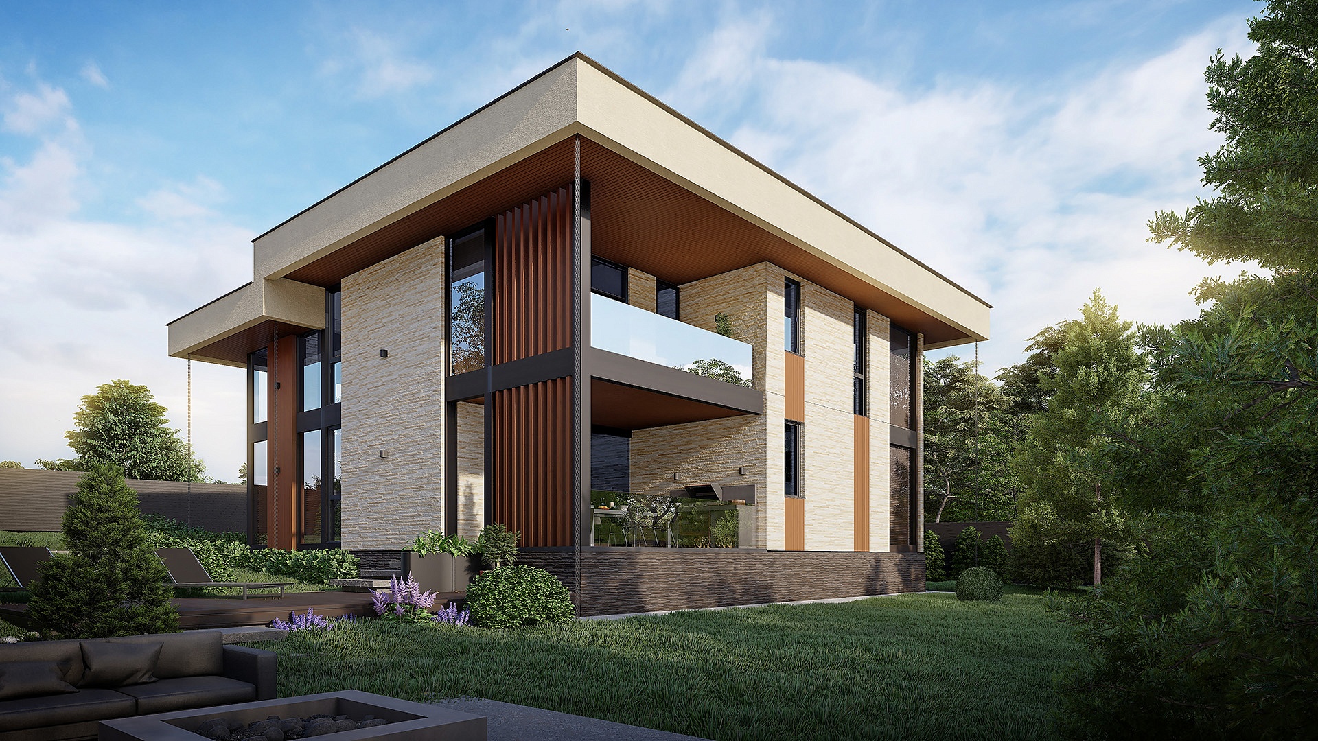 Проект "Гельвеция" сочетает в себе уют и стиль и функциональность. Это фахверковый дом с плоской кровлей и уникальным комбинированным фасадом, в котором сочетаются камень и дерево.