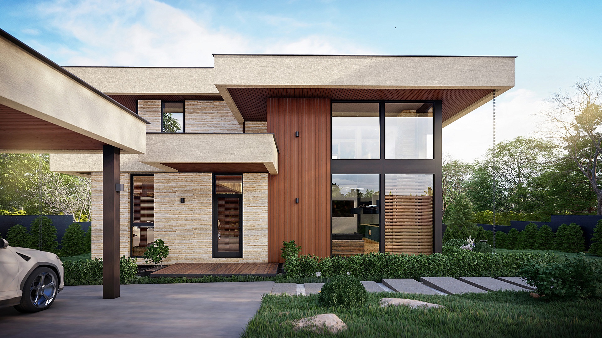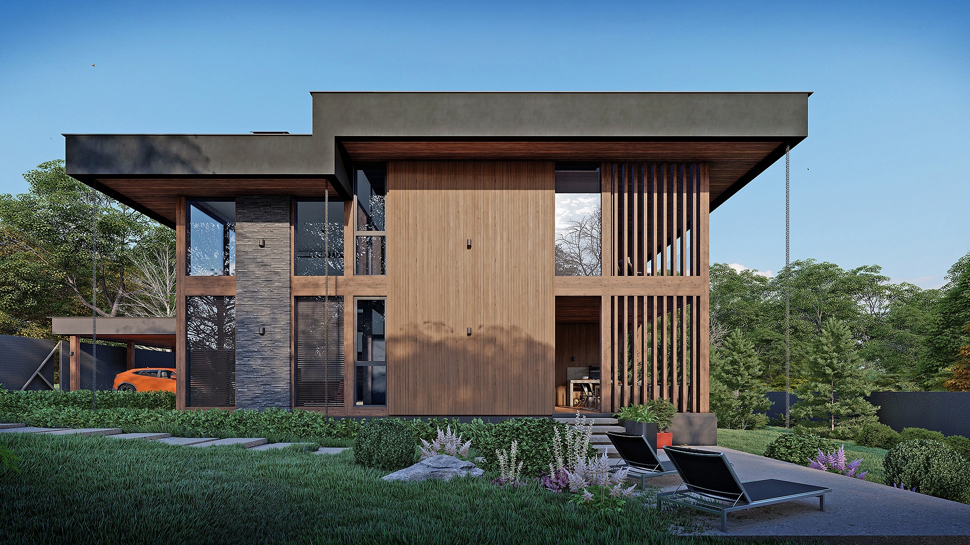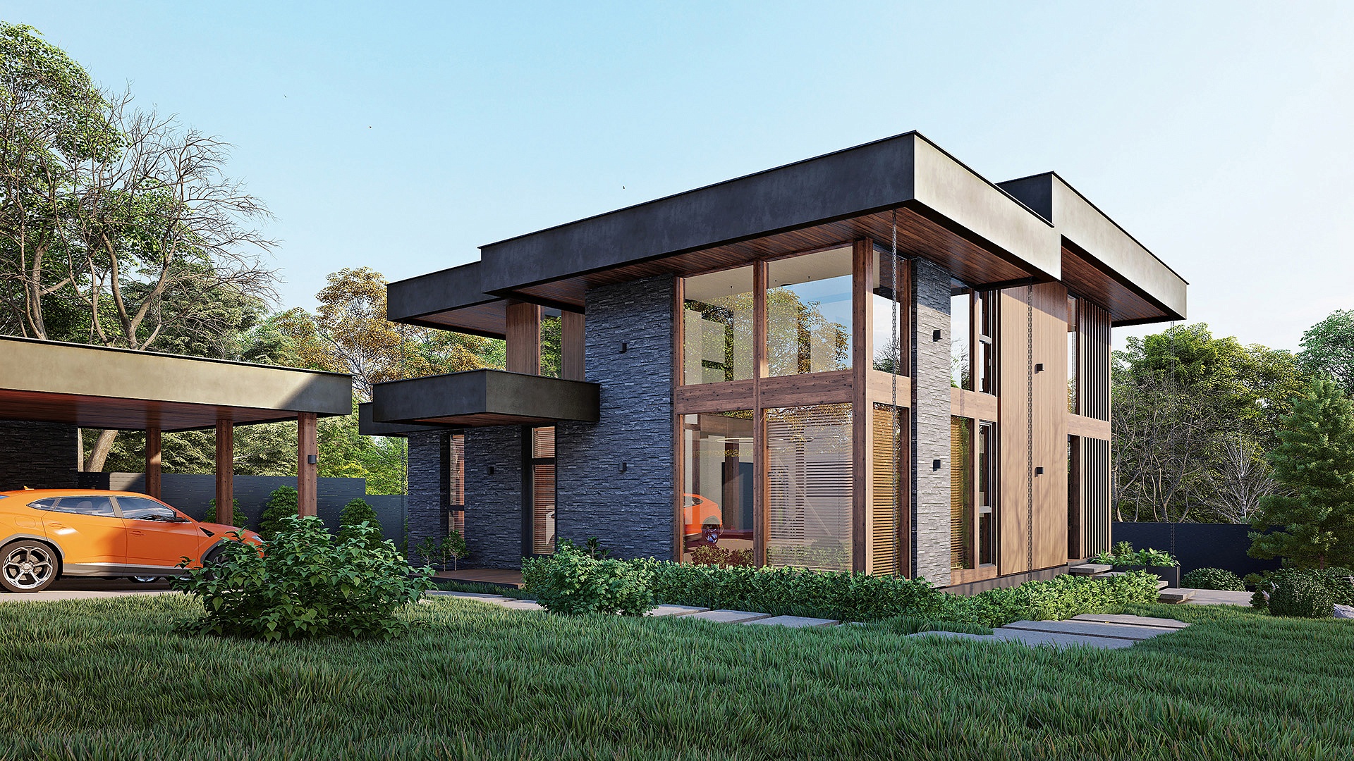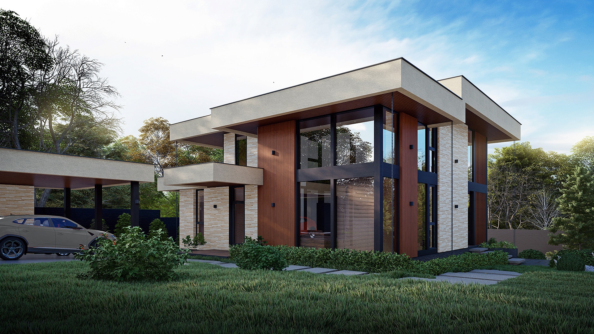 Проект "Гельвеция" сочетает в себе уют и стиль и функциональность. Это фахверковый дом с плоской кровлей и уникальным комбинированным фасадом, в котором сочетаются камень и дерево.