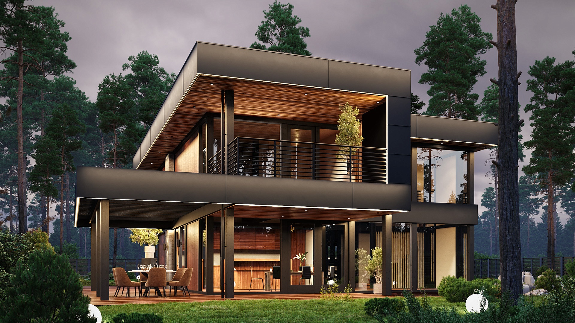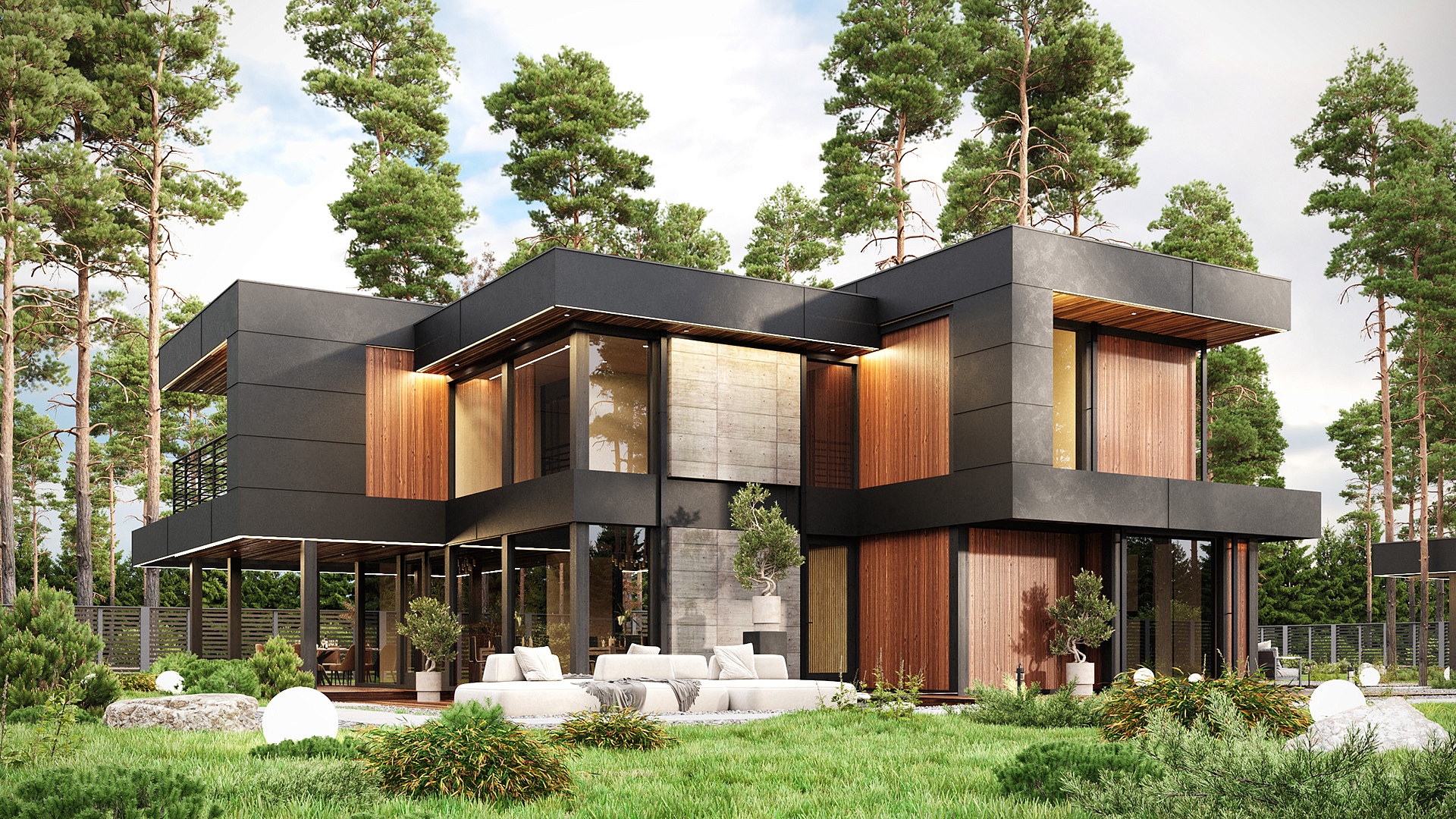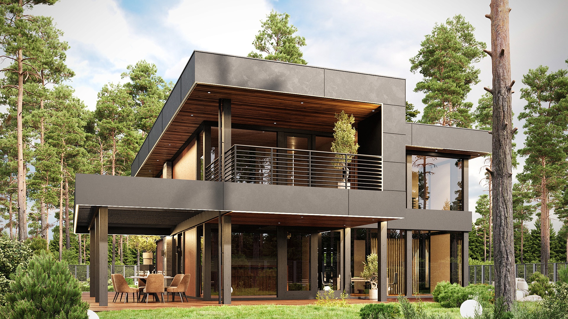 На втором этаже расположена зона отдыха с панорамным видом на окружающую природу, мастер-спальня с выходом на террасу и две спальни.