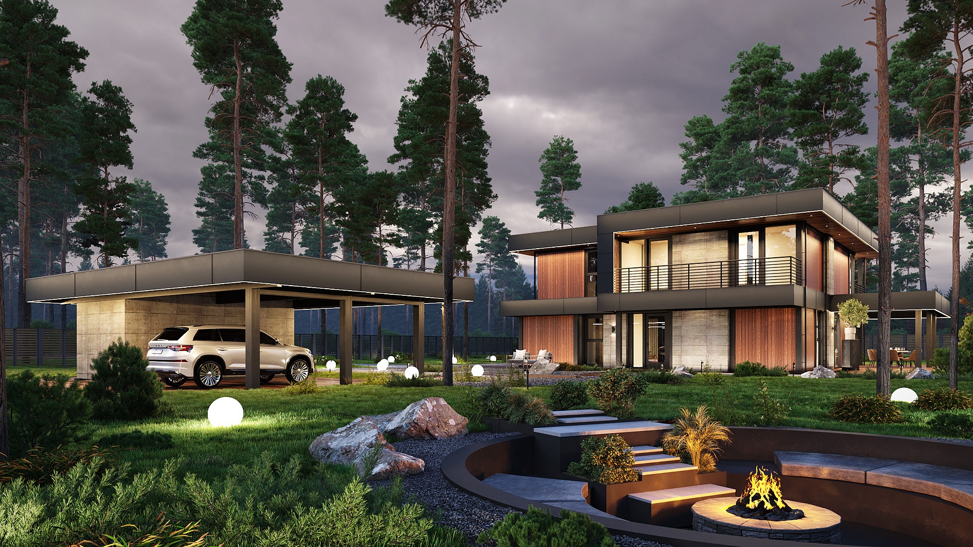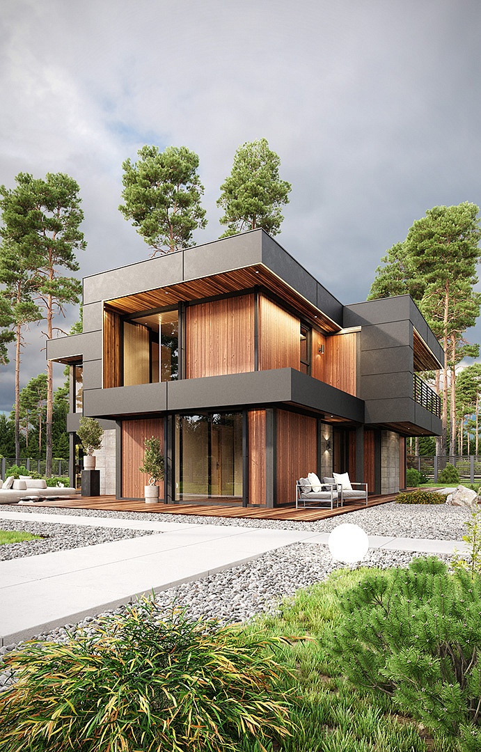 Фахверковый дом “Кельн” с плоской кровлей выполнен в теплых медовых оттенках. Облицовка планкеном гармонично сочетается с керамогранитными плитами серого цвета.