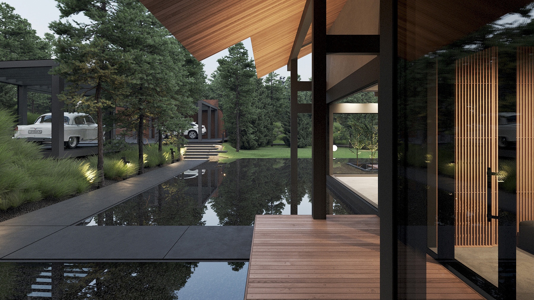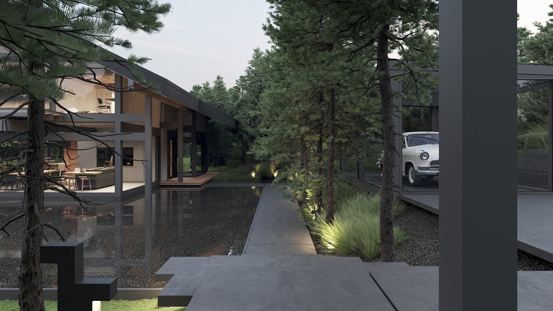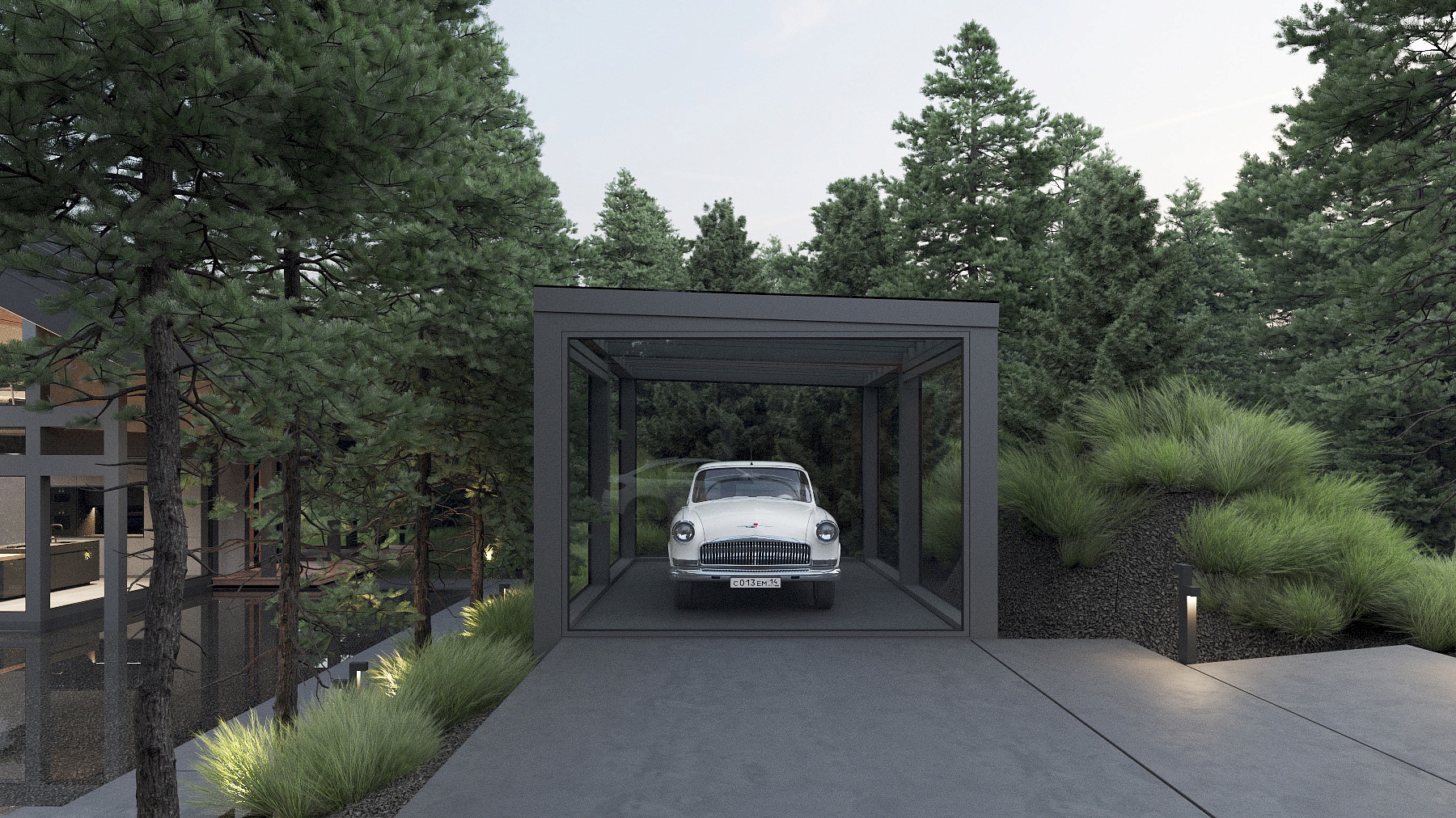 Для ретро-автомобиля заказчика был спроектирован специальный стеклянный гараж.