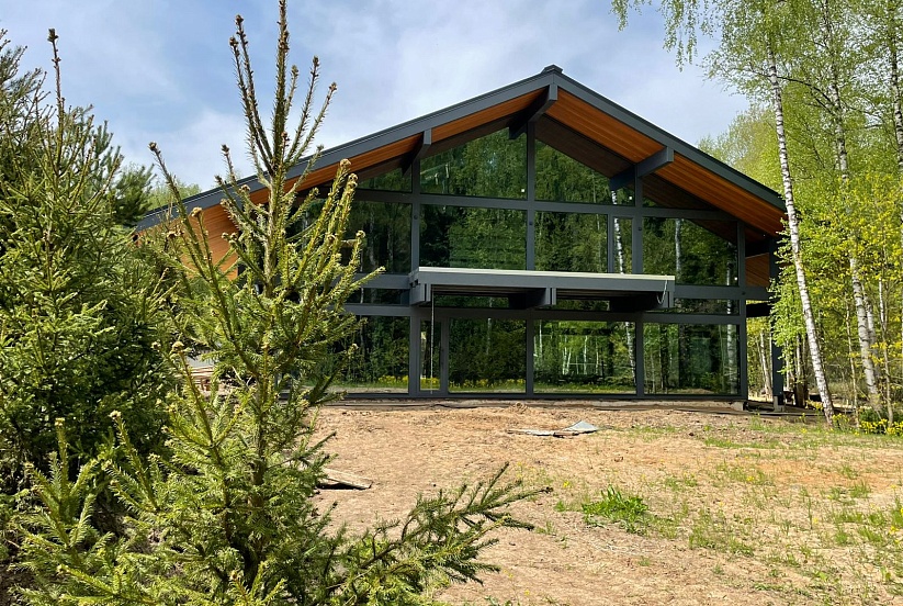 Дом спроектирован с полностью стеклянными стенами, и общая площадь панорамного остекления со специальным напылением составляет 260 кв. м. В этом проекте были применены стеклопакеты крупного формата - шириной 5 метров.