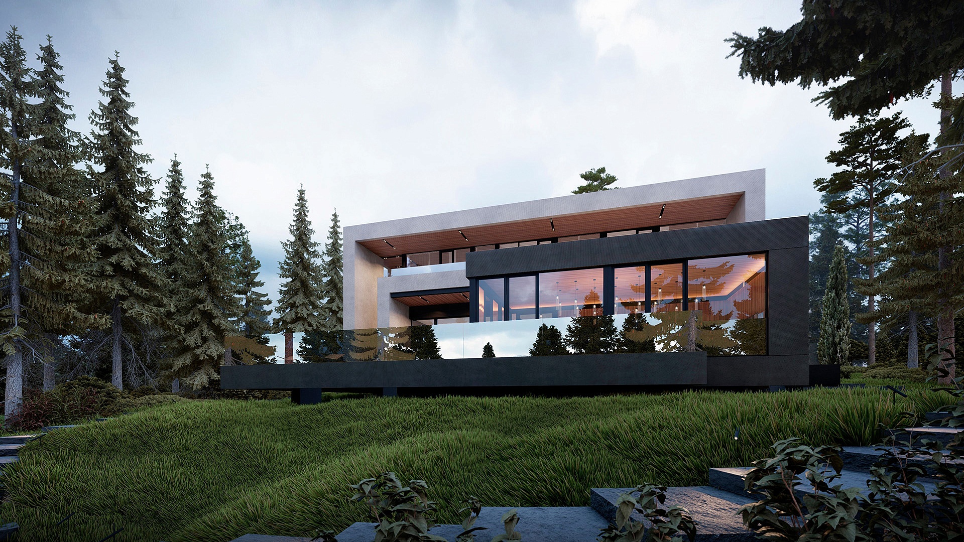Уникальный дом по проекту “Ромберг” идеально вписан в сложный ландшафт с перепадами высот. Плоская кровля, панорамные окна, двухцветный фасад - эти решения позволили сделать дом частью живописного пейзажа.