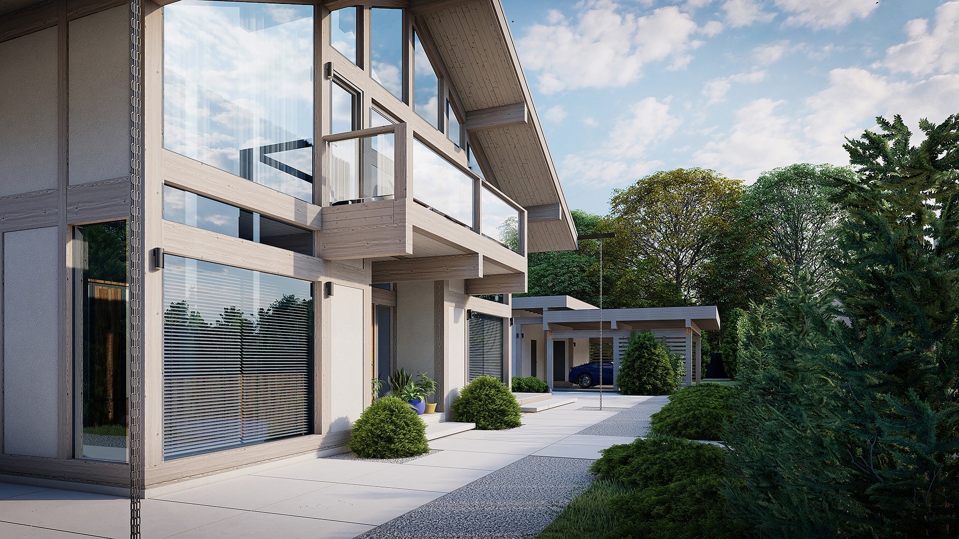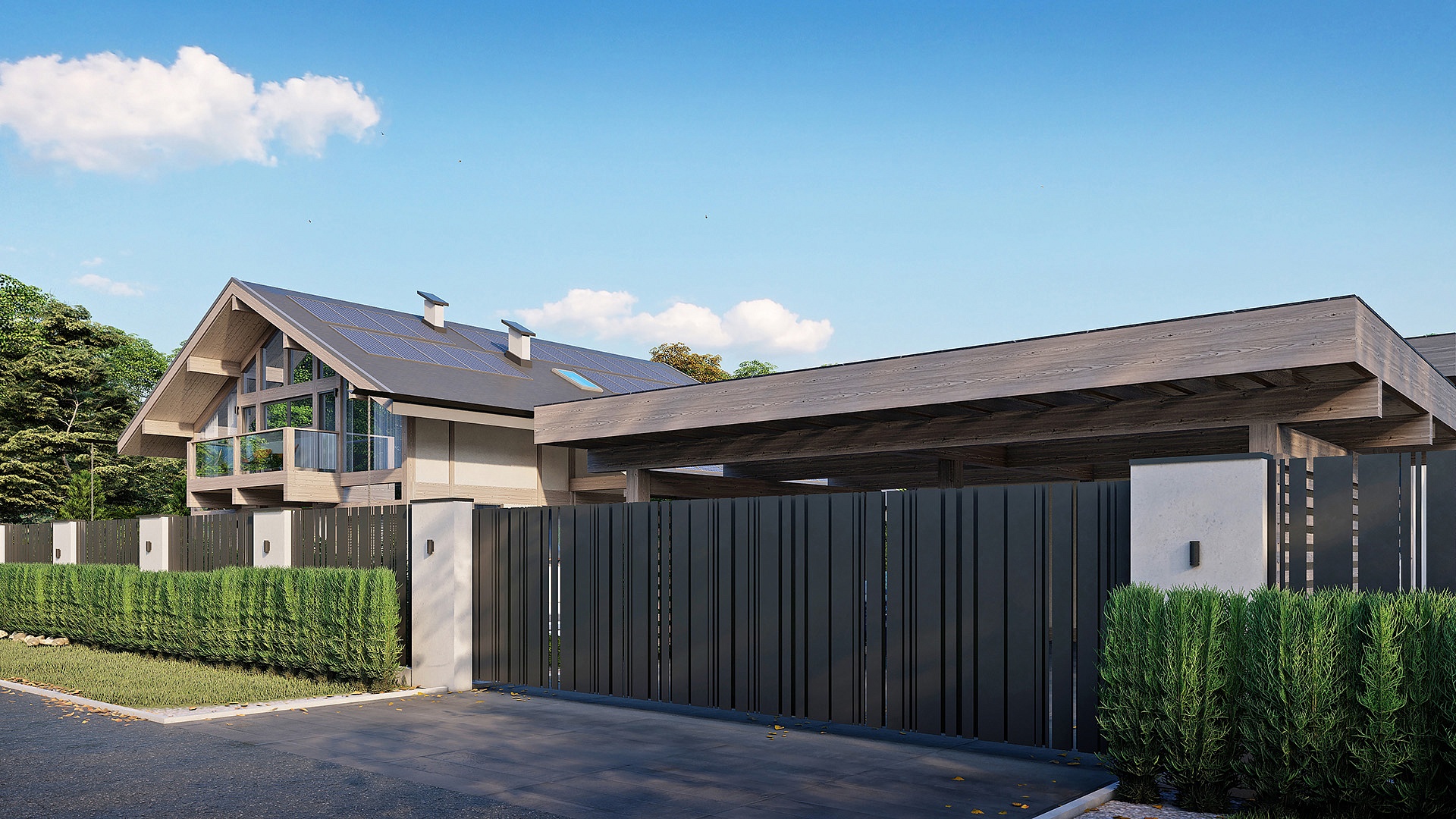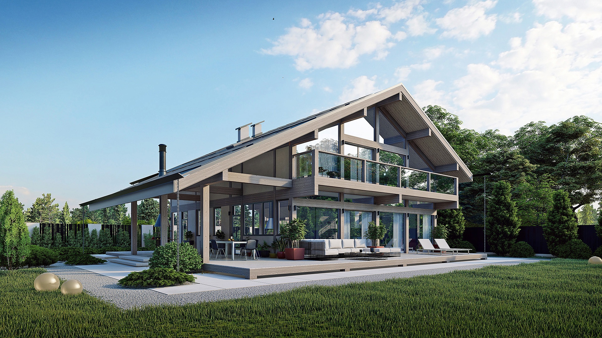 Проект "Вальдорф" – идеальный дом для большой семьи, стильный и современный, он отличается уникальными особенностями, такими как двухсветная гостиная с возвышающимися на два этажа стеклянными стенами и зонированная терраса на свежем воздухе.