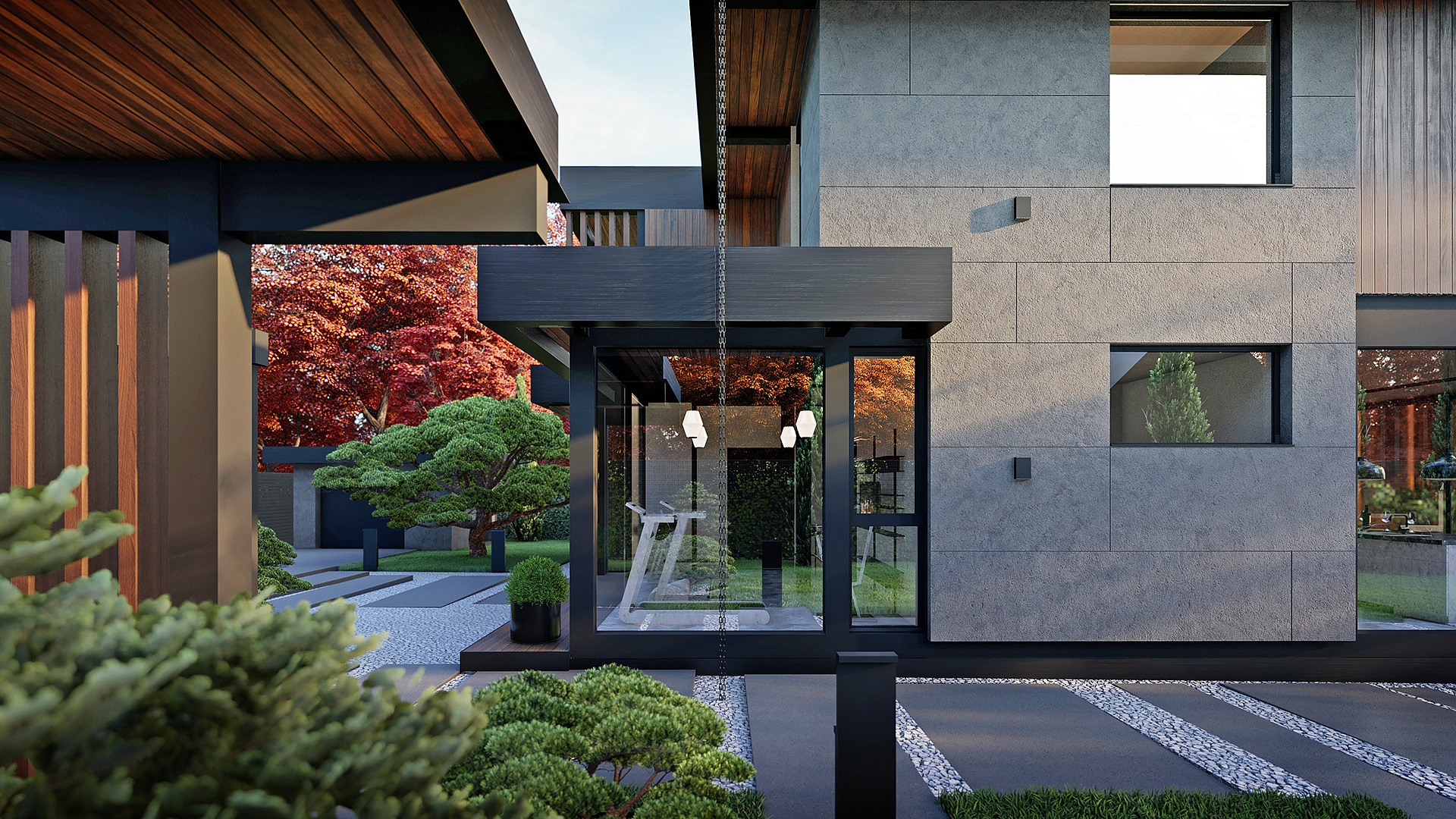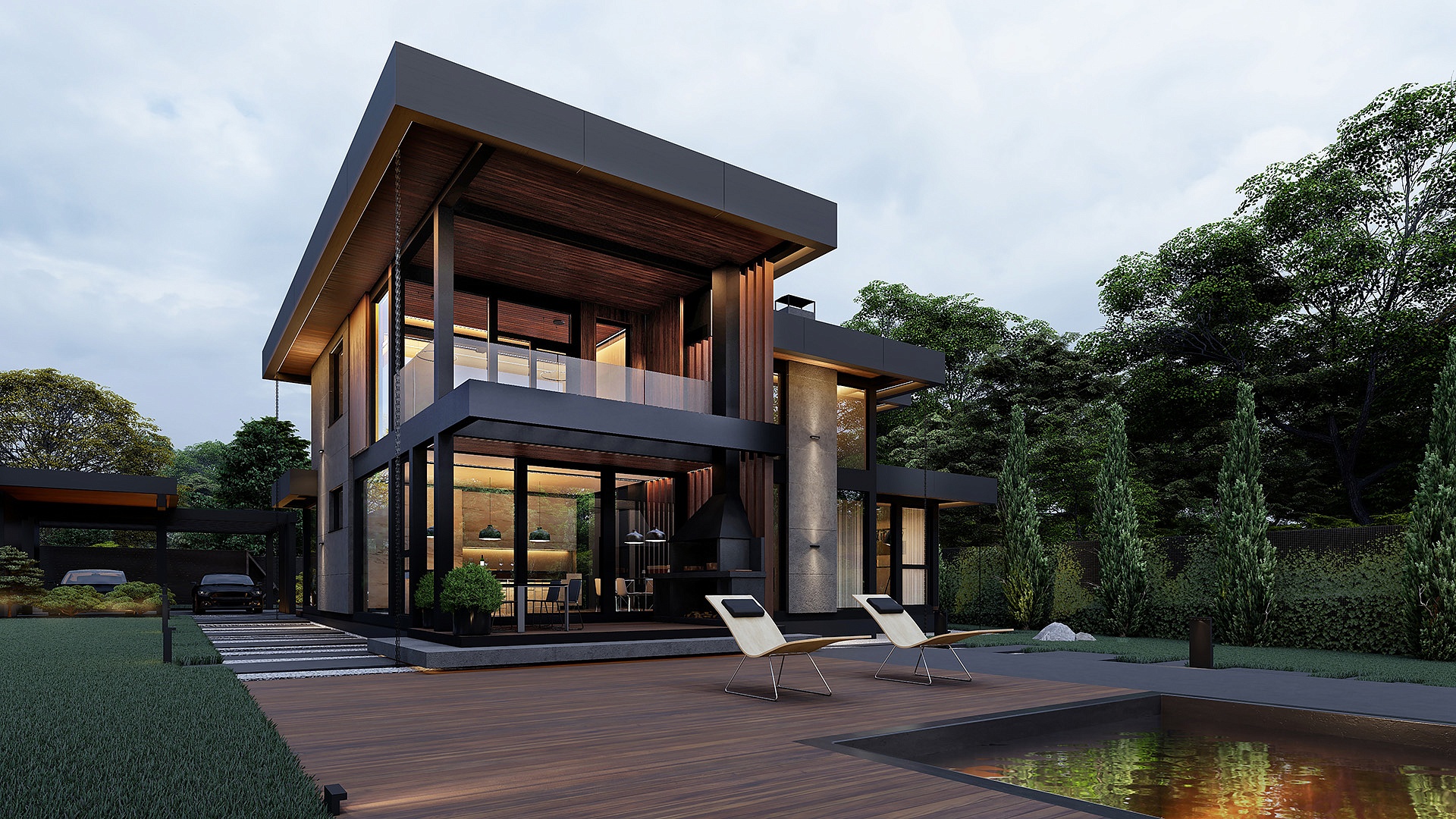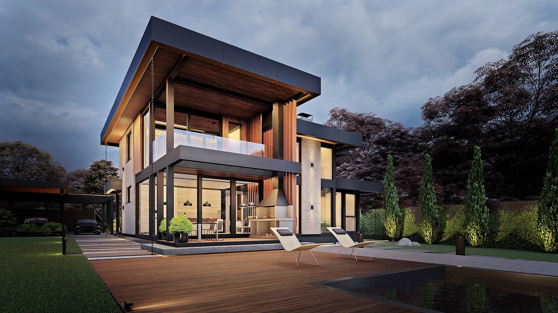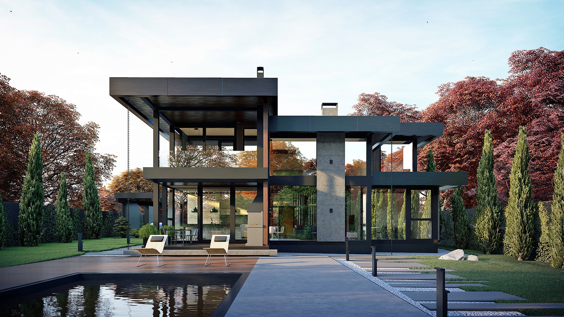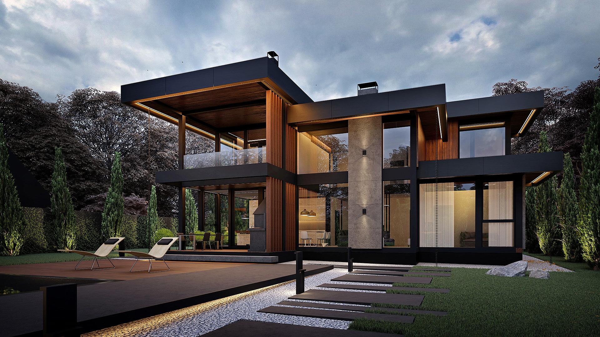 Второй этаж спроектирован для отдыха семьи и гостей. Здесь расположены мастер-зона с выходом на личный балкон, гардеробной и санузлом, а также две дополнительные спальни.