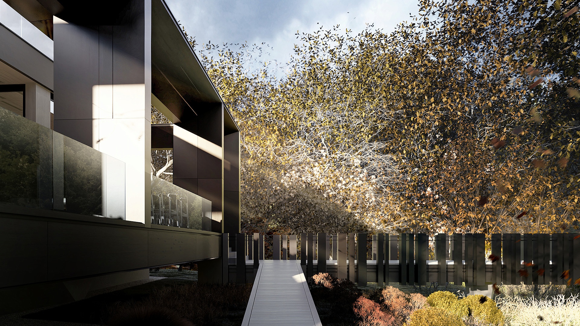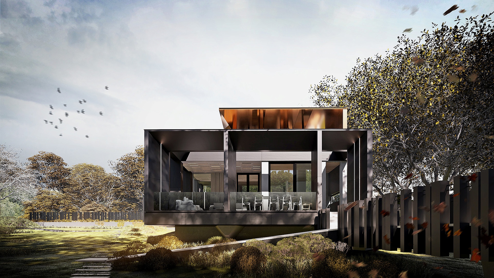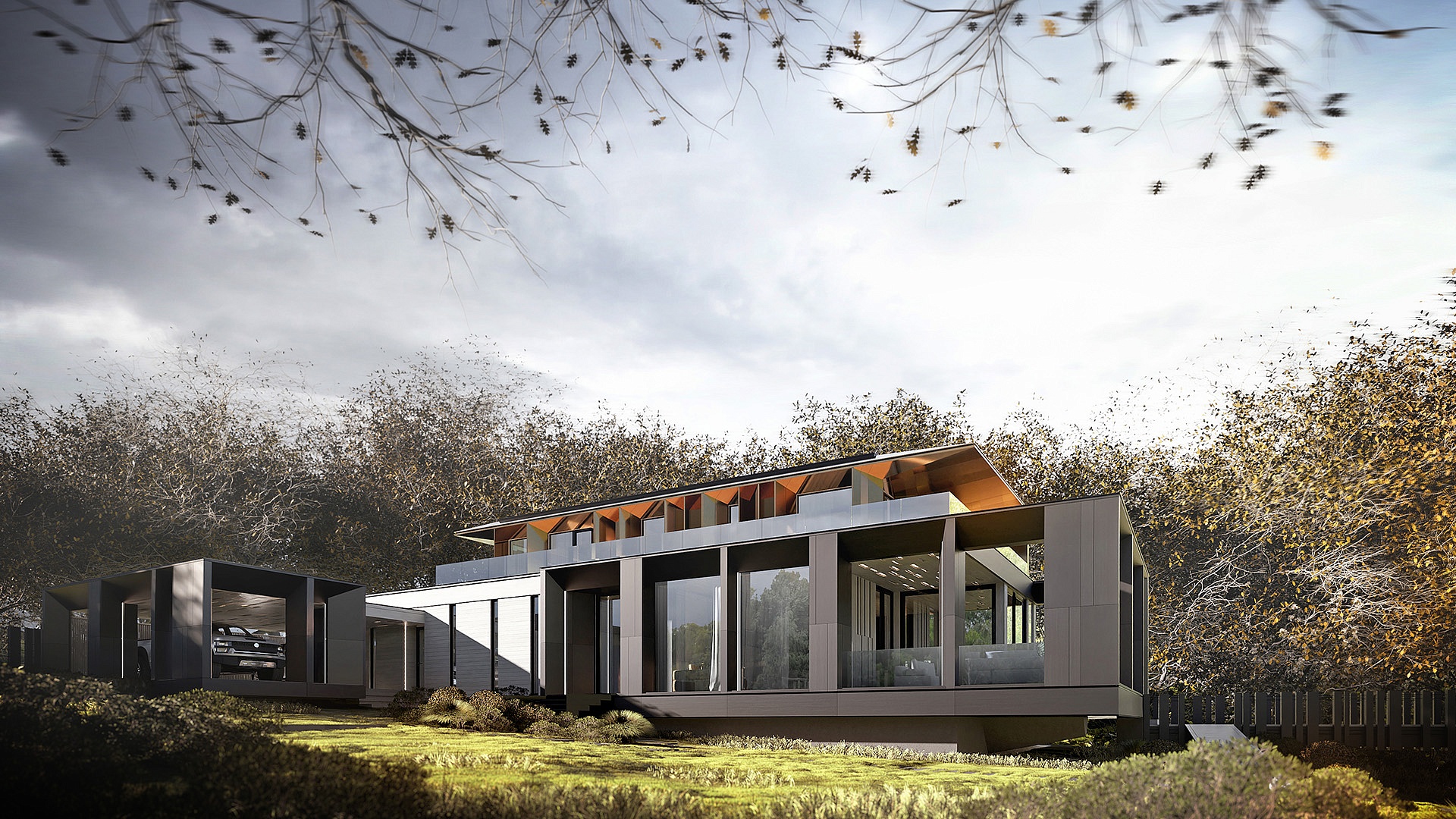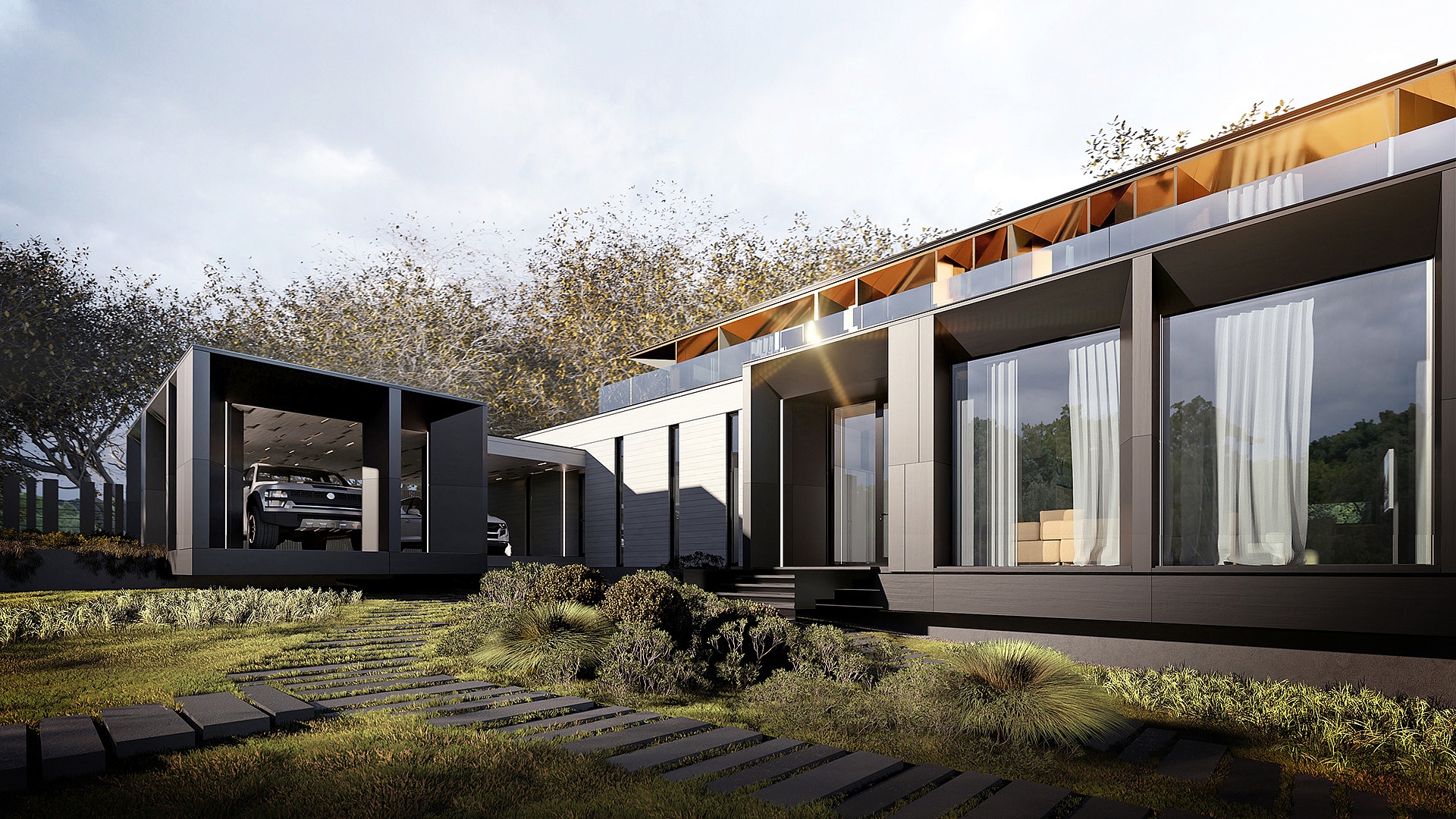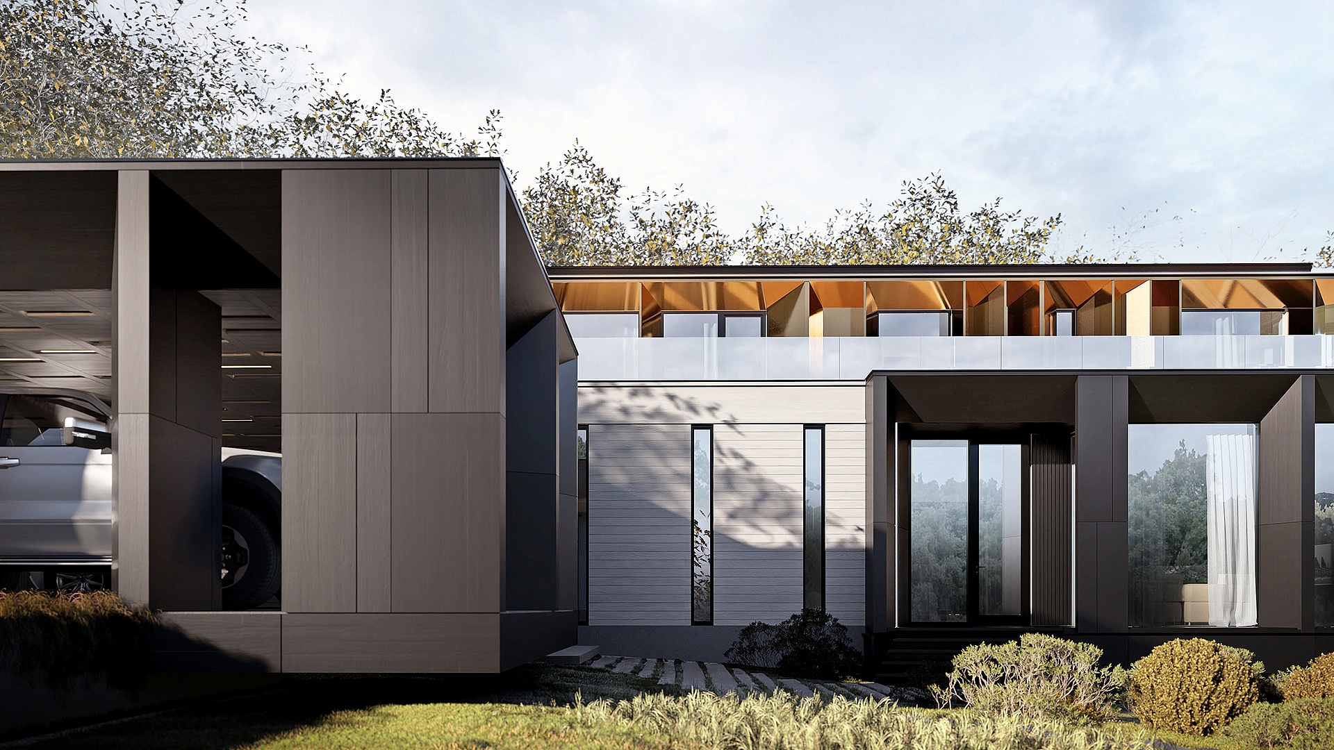 На первом этаже также расположен гараж на две машины и дополнительный навес, который рассчитан еще на два автомобиля. Второй этаж включает мастер-спальню с отдельной террасой, а также два рабочих кабинета для удобного удаленного труда. В отделке дома преобладают монохромные цвета, подчеркнутые теплыми оттенками второго этажа, что придает фасаду контрастность и уют.