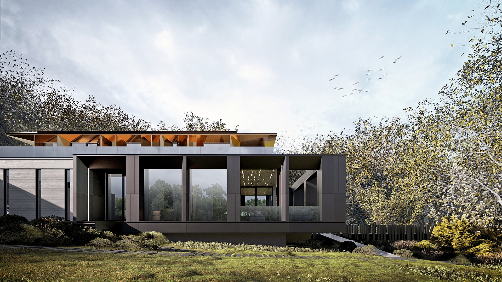 Просторный дом отличается современным дизайном, спроектированный по технологии фахверк. Благодаря панорамному остеклению, дом буквально сливается с природой, создавая ощущение гармонии и свободы. Внутри предусмотрены все необходимые пространства для комфортной жизни и отдыха: спортзал, парная с душевой, большая кухня-гостиная с выходом на крытую террасу, оборудованную уличной мебелью.