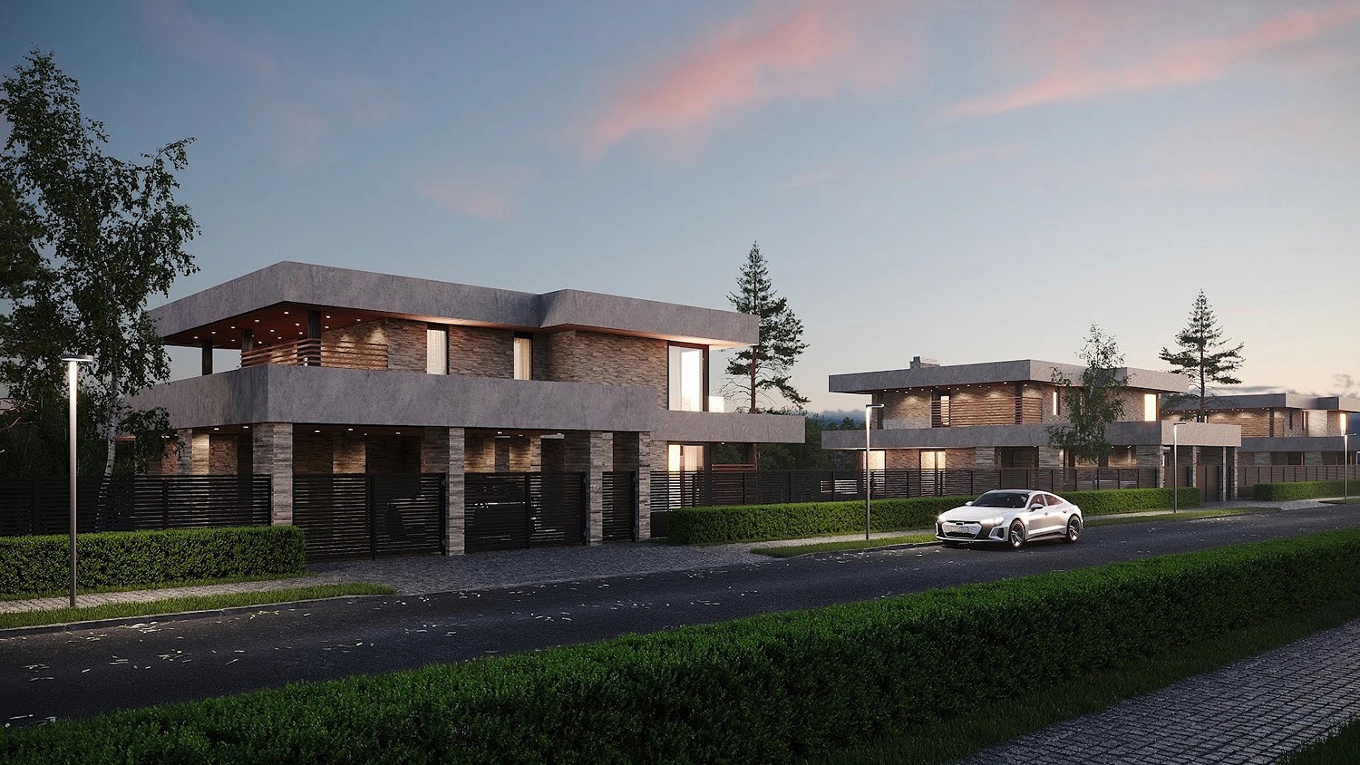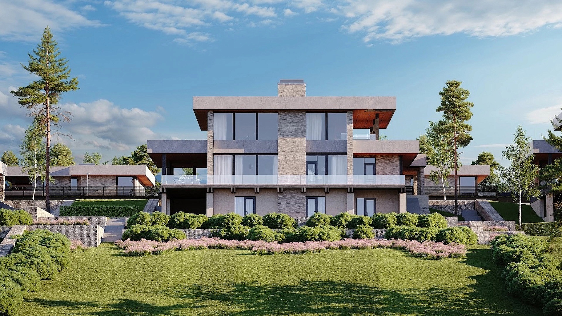 Светлый просторный дом с плоской кровлей и панорамными окнами, его архитектура соответствует современным трендам. Дом находится на перепаде высот и грамотно встроен в ландшафт.